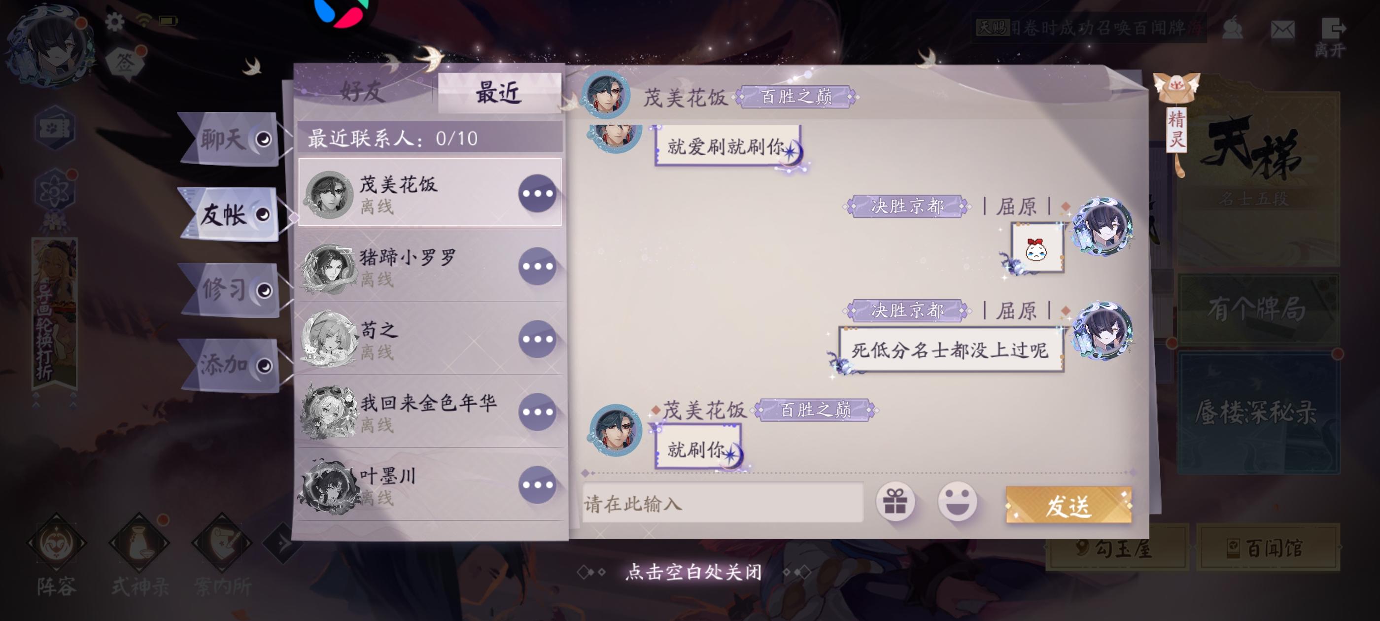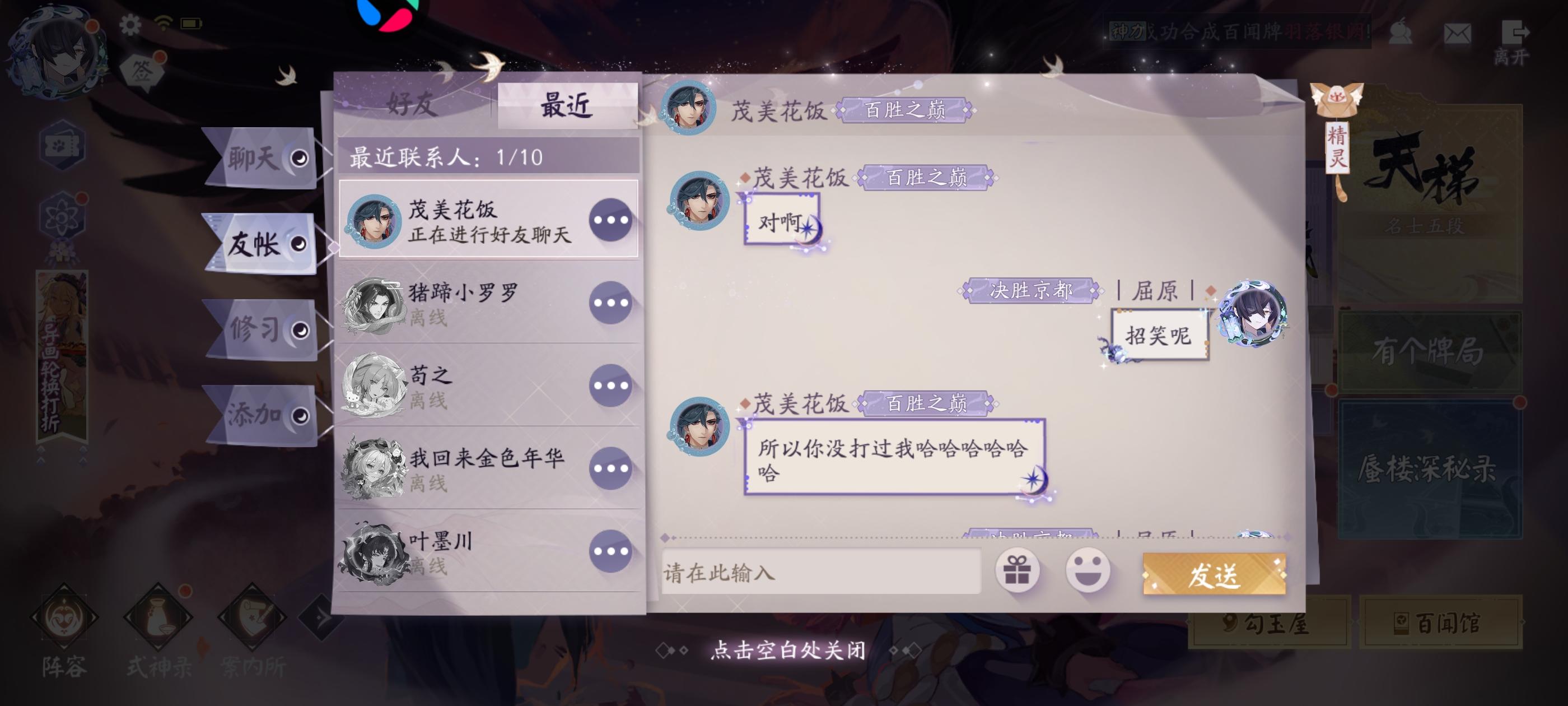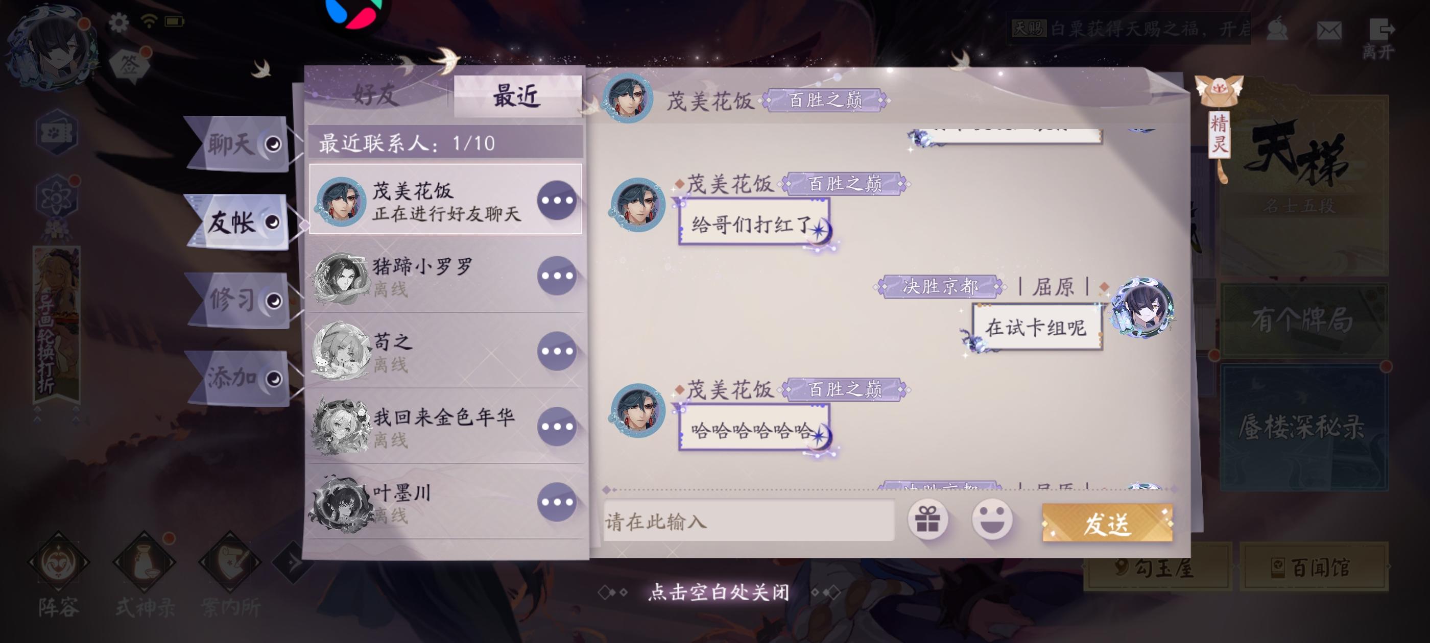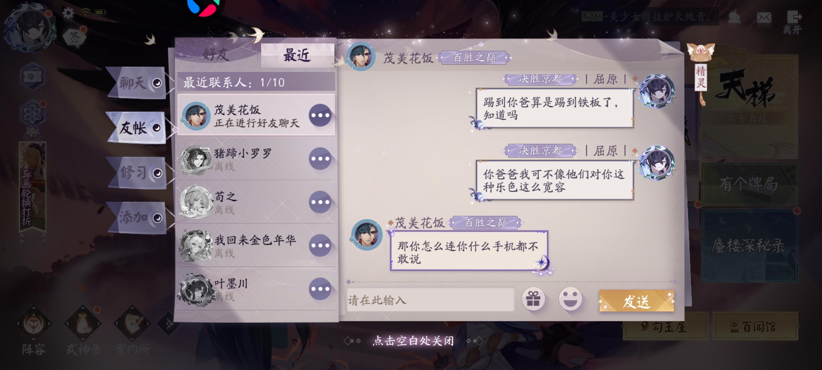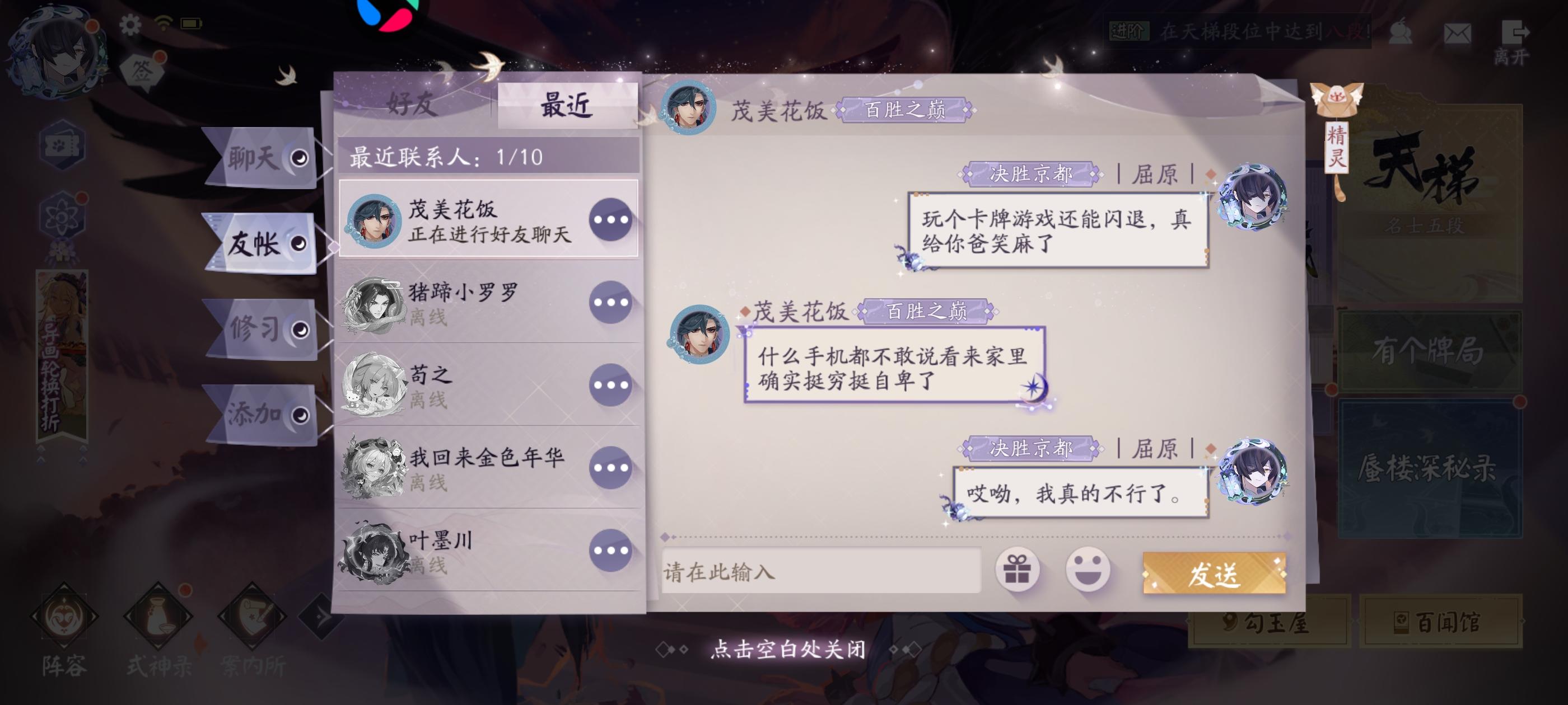 本来打算试了一下卡组,遇到一个红莲快攻队,游戏打没2分钟,一直发表情嘲讽。要赢了就一直刷嘲讽表情。还有荒的嘲讽句。点开一看,八阶三段,我以为多强呢。结果发现这个物品之前就给别人挂过了。喷到一半还发现他游戏闪退了。我真笑嘻了,可见用的是什么老人手机。叫他打单挑,他又不敢打。就纯口嗨。