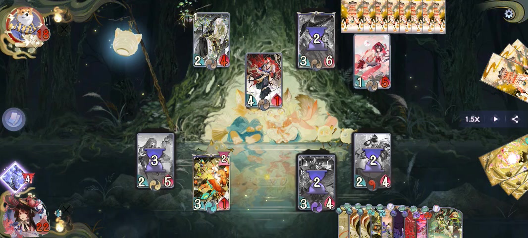 主要思路就是频繁交互抢血。你跟我交互就刷古笼火被动,空场就得吃妖刀和歌留多暴力打脸。有考虑把鬼使白换下去,但是鬼使白在整体更综合一点,不怕死+过牌+一点点的解后+一点点身材。绿刀我个人习惯是带一张不祥之刃拉一下一勾节奏还有过一下牌。古笼火ssr纯兜底,主要没啥好牌。鬼使白过牌带两张亏节奏,有考虑把一勾幻境换一张觉醒。歌留多没有技巧只有强度,少有的配合应该是一勾法术给古笼火刷被动。
