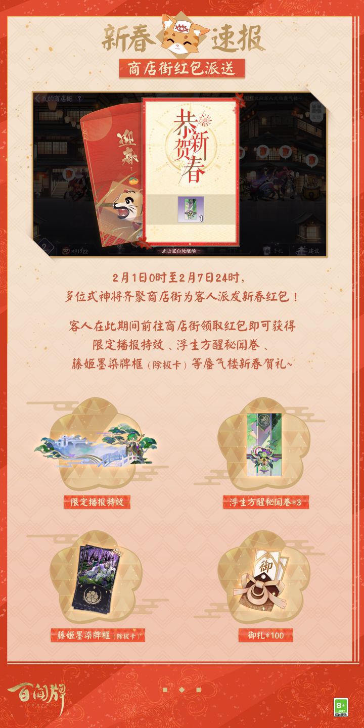 新春佳节即将到来,为邀请客人们共贺新禧,商店街将开启红包派送活动~式神们已经备好了各种红包奖励与新年祝福,就等待客人届时前来接收了!客人在活动时间内前往商店街,即可直接领取式神们派送的新年红包奖励,内含限定播报特效「播报·苍松」、「浮生方醒秘闻卷」、「藤姬墨染牌框(除极卡)」等惊喜新春贺礼~