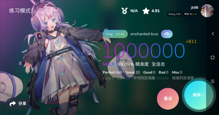 就在昨晚我刷理论的时候居然刷出了SSS评级下的100w分!虽然上传到官网上的成绩是999999,但我也因此收获了入坑16个月以来的首个+1~\(≧▽≦)/~