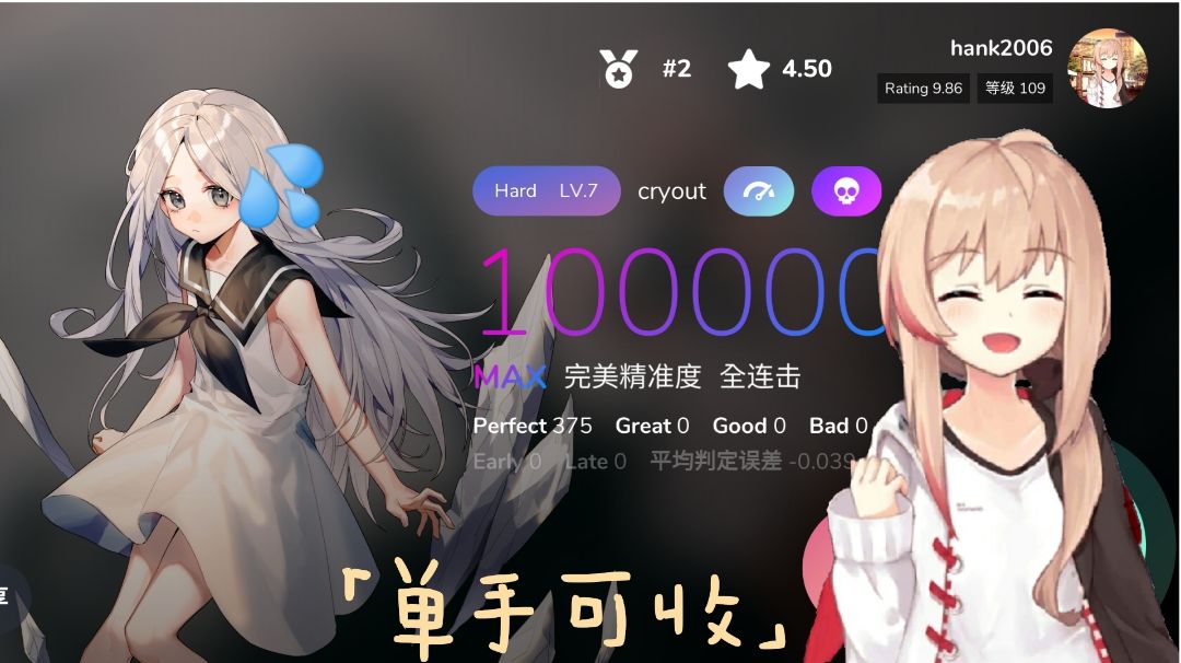 感谢jam送的手机支架! cryout是我在Cytoid的本命关,半年前完成双手理论后便萌生了用单手把这关继续玩下去的想法,于是就有了这个视频( 这个视频耗了我不少精力,自6月22日起重开了111遍才理论,剪辑又花了将近2天。这是我第一次剪辑手元视频,有不足敬请指出… 好久没p生草图了,这次直接把视频前面制作成了生草视频,想直接看手元的请跳转至1:30处(