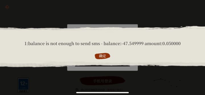 手机号登录提示 balance is not enough to send sms,无法正常登录问题描述:在弈剑行游戏中尝试使用手机号登录时,弹出如下错误提示:1:balance is not enough to send sms - balance:-47.549999 amount:0.050000导致无法完成登录,影响正常游戏体验。设备信息:• 手机品牌/型号:iPhone XR