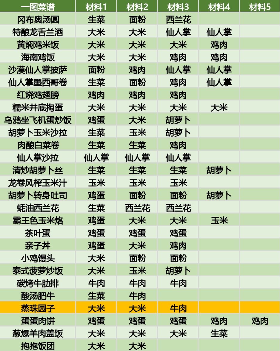 帖子和评论区放了新版的菜单,有需要可以看看。 PS: 1. 主要改动是加了7-9图下线时用的收益菜的菜单,前1-6图的菜单没有改动。 2. 7图屯菜去掉了同袍小兄弟,加了水果煎饼,东西之战。 3. 收益菜去掉了同袍小兄弟,加了东西之战 4. 修改菜谱推荐逻辑,收益为最高优先级,只排除小菜,菜单大范围重置。 5. 添加1-9图美观小菜推荐 6.七图收益菜单添加料理搅碎机。 该文档包含除狩猎外的所有游