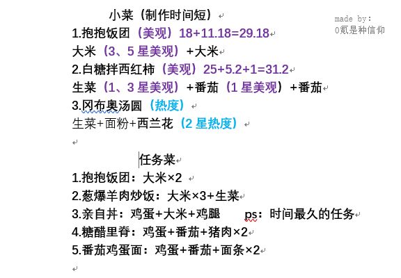 *表格没更新,里面的数据都是最新的,因为游戏没开新图,没有新食材,也没新菜。 我已经不玩了,不用加我好友了,也不收徒。后面要是游戏更新了菜谱可能会继续更新。 绿黄底是优先做的菜(红字代表食材可能会耗尽),白底红字是绿黄底中某一食材的上位替代但是可能会耗尽; 建议13口锅做绿黄底非红字菜,羁绊锅轮流做四个绿黄底红字菜。 ====2.7版本20道新菜皇冠配方==== 无 =========表格食用方法