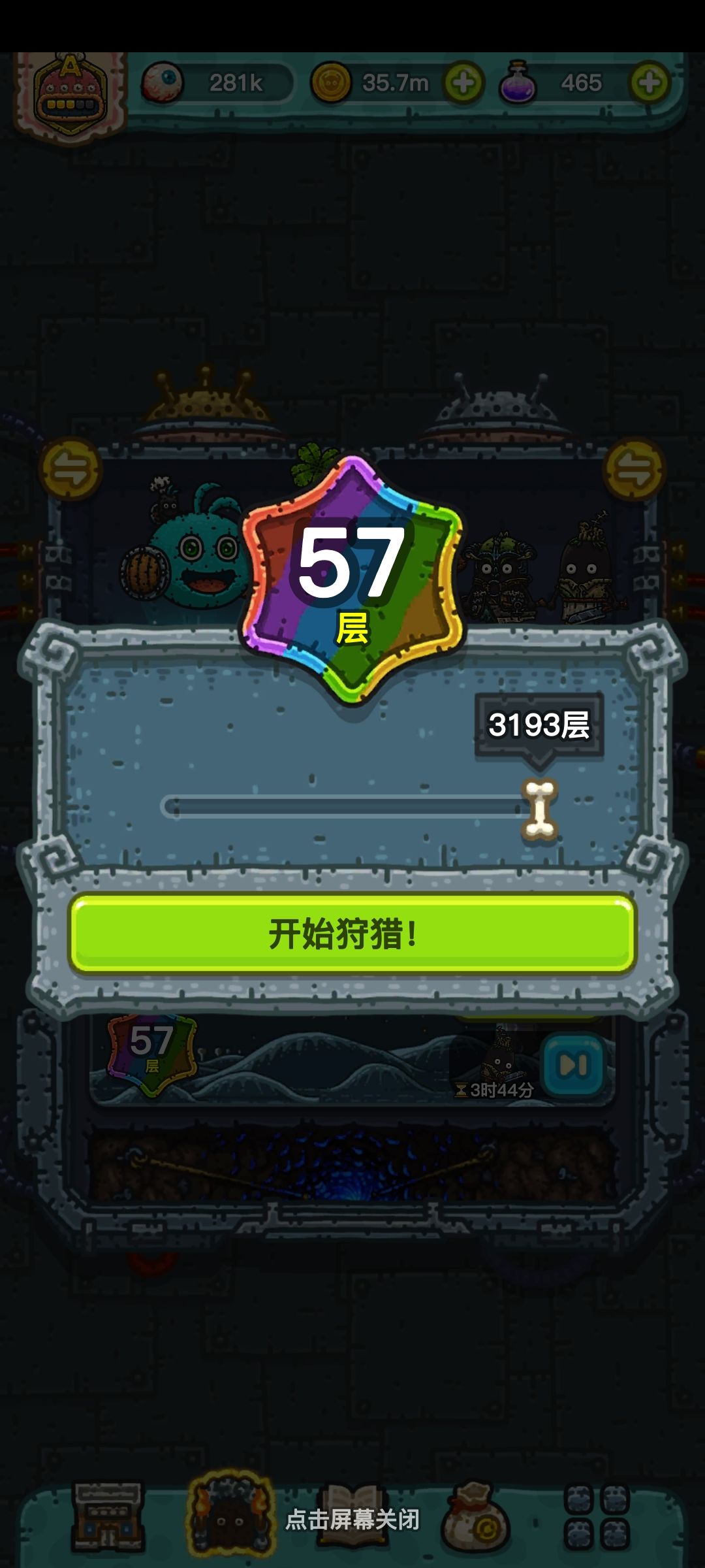 众所周知:狩猎有一个卡关卡bug就是在不拖动关卡数的情况下会有一个卡进高层的bug 通常来说这个bug没什么用重新滑动一下就好了,但是我们就是要利用这个bug卡进合适的高层完成速通。 说一下原理:经过我的多次实验发现 由于正常关卡和bug关卡为正比例函数 所以正常关卡最少超过8层就可以到达50以上 首先我们要先打到最高层八层,也就是进入第9层后退出(切记不可超了因为正常关卡加一关就影响bug关卡的