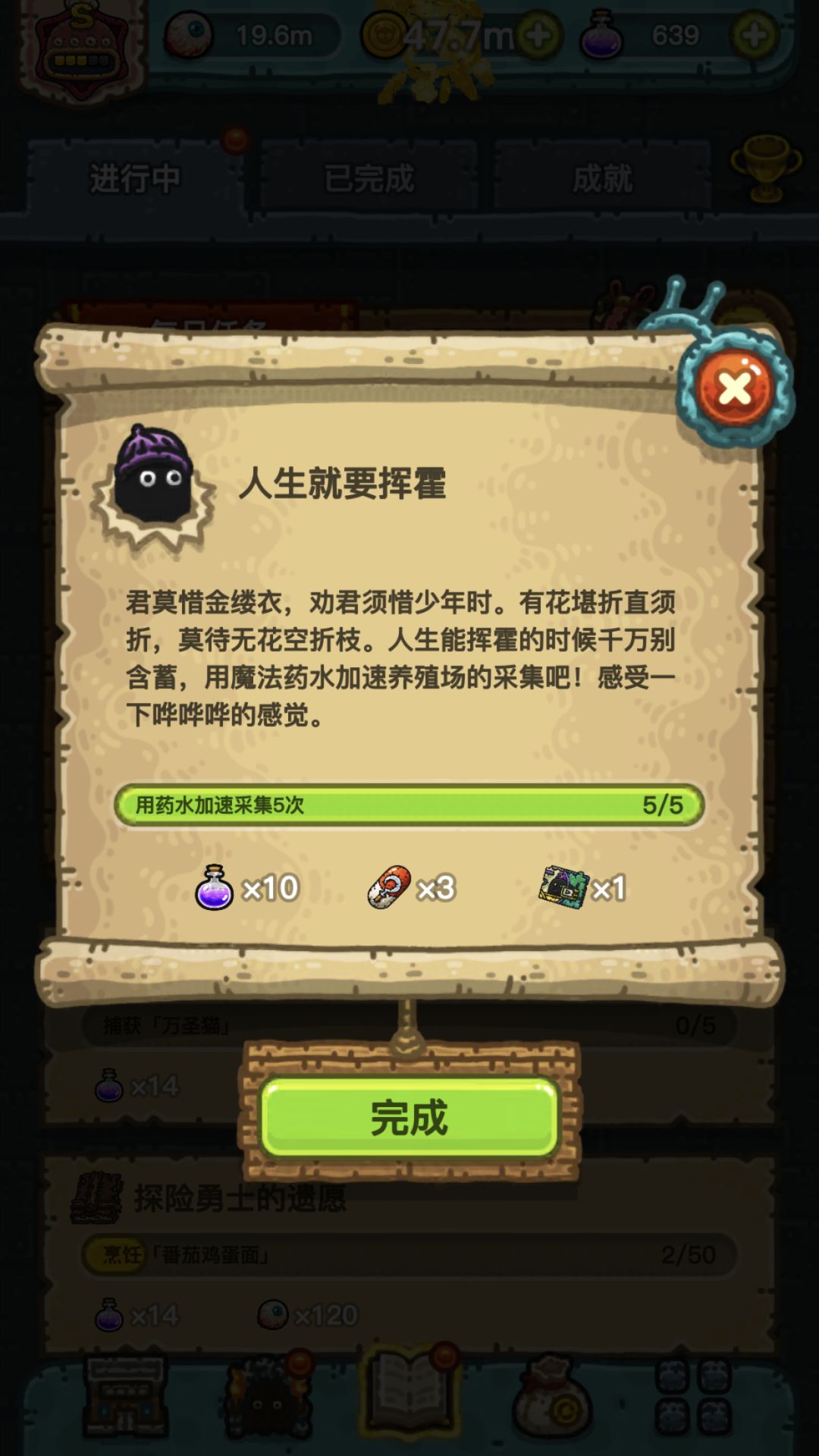 做任务刷药水教程 1.万圣猫,先在经理上放一个草丛90%几率进一次出一个 2.仙人鼠,弄个怪兽蛋概率刷蛋刷药水两不误 3.亲子丼任务,32级锅一个12分钟,开个狂欢2小时就好了放上经理烹饪+5.6%,和额外烹饪yyds 4.羊肉盖饭,一分钟,开个狂欢40分钟好了,一个烹饪不消耗食材,和额外烹饪yyds 这里做菜任务全靠着额外烹饪救命呢所以额外烹饪先给他升级升到4~9级 5.鸡蛋面,还是老样子烹饪额