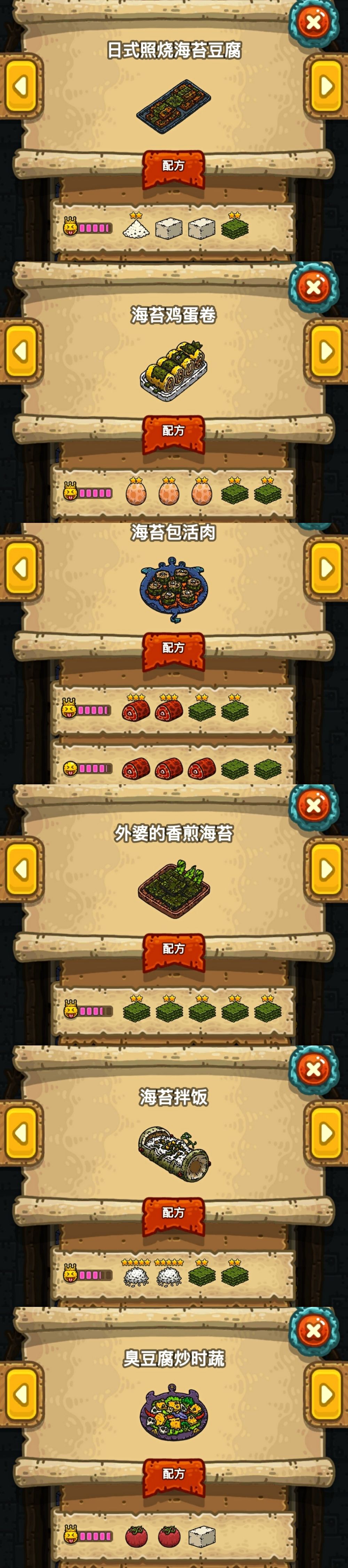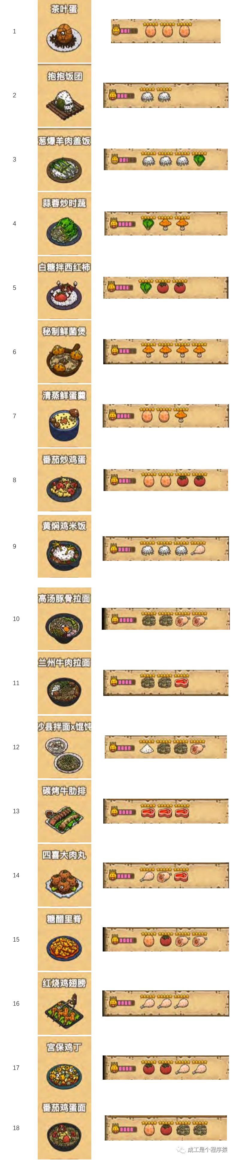 之前有个大佬关于皇冠菜的帖子不见了,因为根想到会删帖,所以没保存,然后因为游戏回档了,要重新玩,很多皇冠菜谱不知道咋做,所以去酷安那扒了一篇19年还是18年的帖子,虽然可能不全,而且画质很差,而且排序混乱,但还是可以满足新手的使用