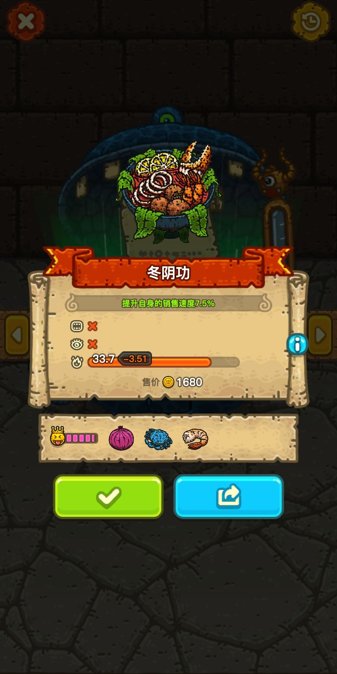 一道材料完全比不过其它菜的菜,因为是口味属性,在升满后~居然出现如此夸张的性价比!而其它高价值材料的菜,就算升满热度属性却也不涨任何的价!热度属性可是很难升的啊!看来对于刷钱的菜谱选择,又得谨慎的好好挑选了!