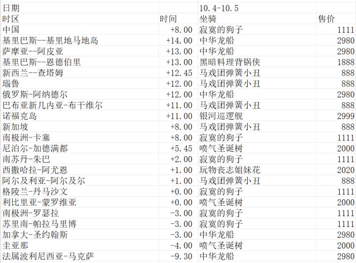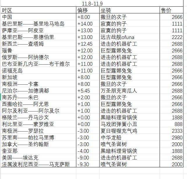 圣诞岛(基里巴斯)-矿工霍巴特(澳大利亚)-背锅侠巴黎(法国)-狗圣约翰斯(加拿大)-喔喔鸡塔伊奥哈(法属波利尼西亚)-龙舟坐骑购买顺序推荐贴https://www.taptap.cn/moment/591720026298385366?utm_medium=share&utm_source=copy&shar...⚠️修改时区办法➡️https://www.taptap.cn/mom