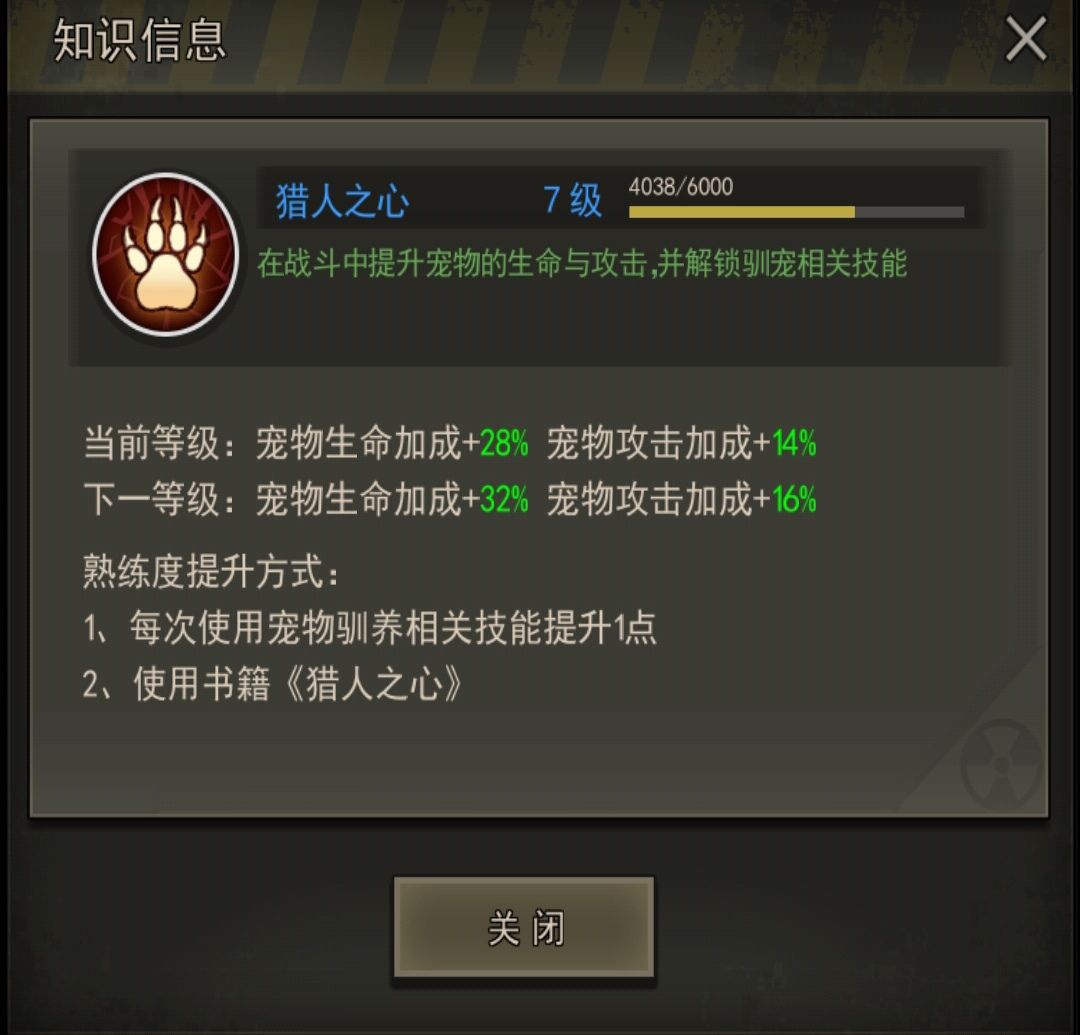 这边来浅水下宠物混子(我)的摸鱼玩法,大佬们就当个乐呵看就好。 首先是猎人的知识猎人之心,使用50个紫玉米在树林找刘衍兑换。满级可给宠物增加40%血量20%攻击。可以通过安抚鼓舞抓捕复苏这四个技能可增加该知识的熟练度,不过一般常驻使用的是安抚跟鼓舞。(紫玉米在种植园种玉米概率获得) 接下来是猎人的安抚技能,有了这个你就是一名合格的兽医了(手动滑稽)安抚是猎人之心的伴生技能,不需要熟练度即可获得。满