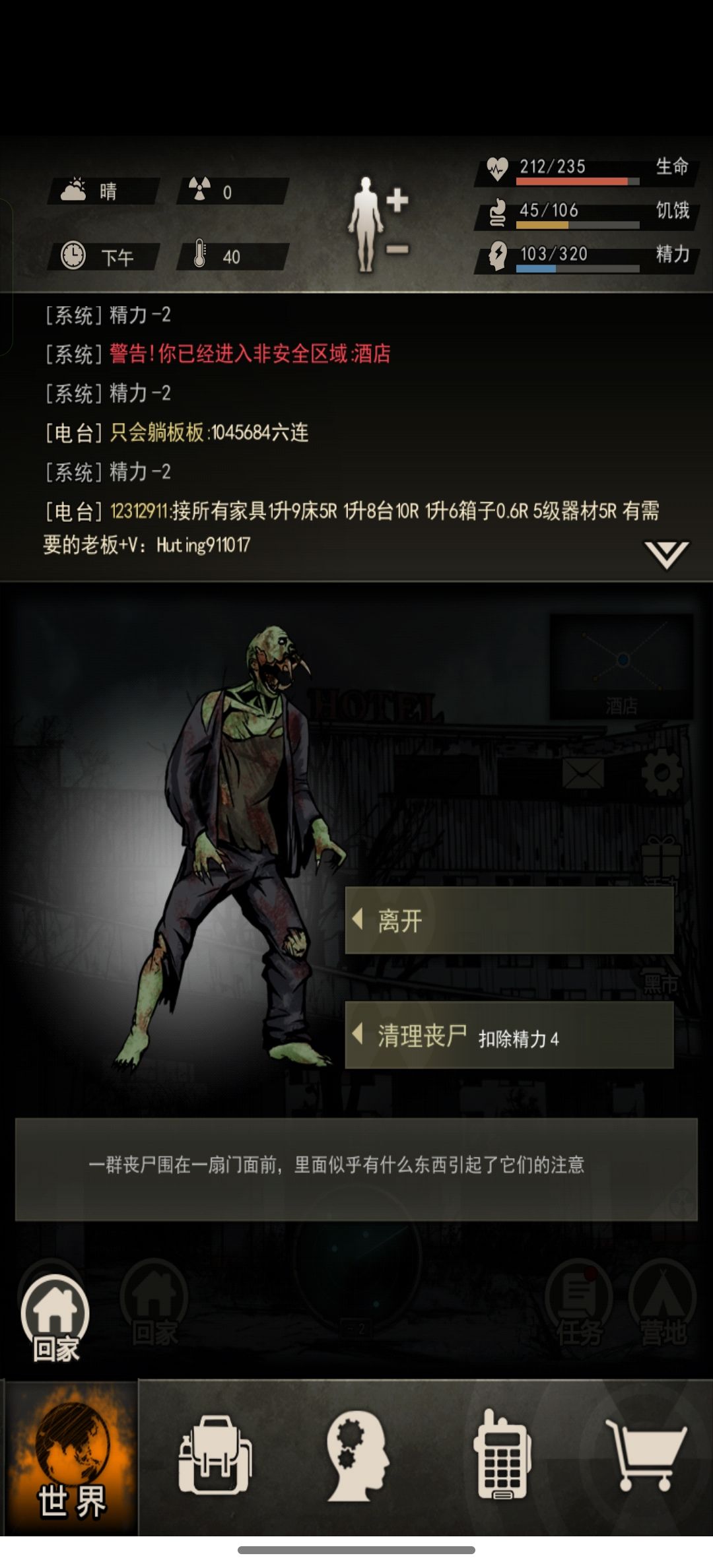 (野生)变异丧尸:50 (野生)变异丧尸犬:49 门:100 (门后)强壮丧尸:52 (门后)强壮丧尸犬:48 (门后)变异丧尸:52 (门后)变异丧尸犬:48 (门后)金属碎片:73 (门后)杂物:298 (门后)钢管:37 备注: ①深夜不搜,默认特殊事件已完成,石林、高速服务区已解锁,忽略天气、时间对概率的影响。 ②以上数据若挂机搜,消耗精力1097;若大退且仅搜门,消耗精力998。 ③不统