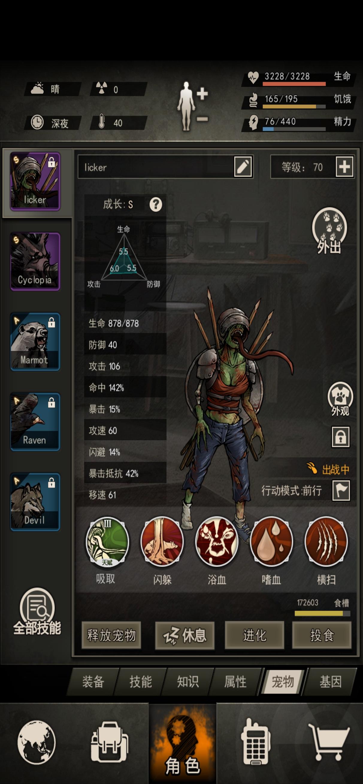 手残,瞎几把走位。。 开局让宠物突进挡一波快速射击,丢燃烧瓶骗高精,再开快闪躲狙击后自动输出技能一波带走鬣狗,剩下的站撸就好了。。 属性和技能参考。。