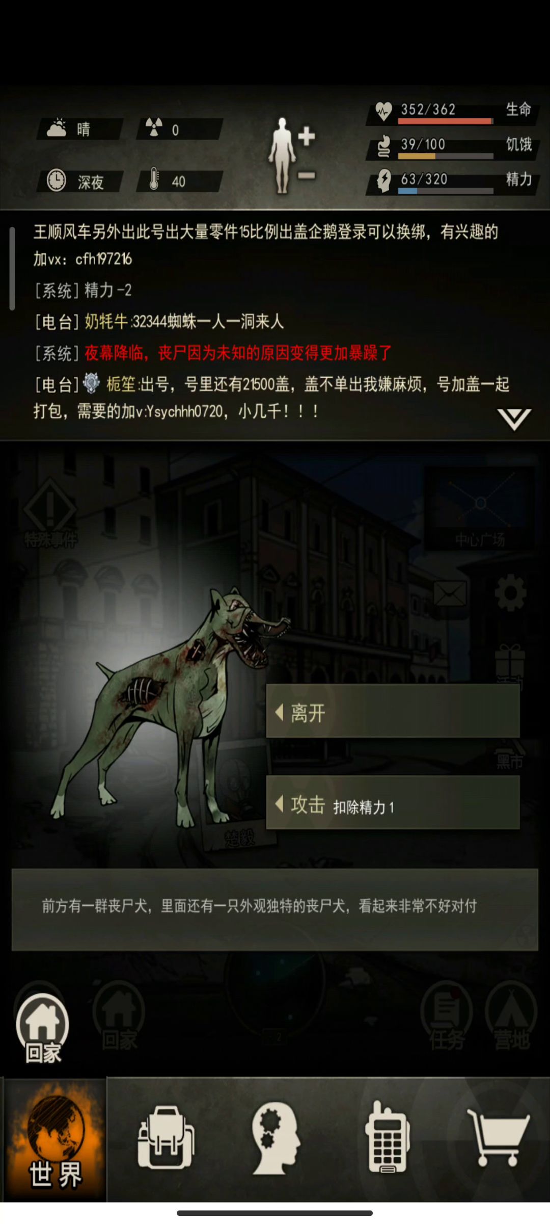 (野生)普通丧尸:141 (野生)强壮丧尸:46 (野生)劫匪:118 货架:108 (货架)饼干:338 大货架:29 (大货架)饼干:90 (大货架)巧克力:23 冰柜:167 (冰柜)水:401 备注: ①深夜不搜,不携带塑料瓶,默认特殊事件和每日任务已完成、集市已解锁,忽略天气、时间对概率影响。 ②以上数据若挂机搜,消耗精力2435;若大退搜索且仅搜水,消耗精力1719。 ③不统计怪物掉落