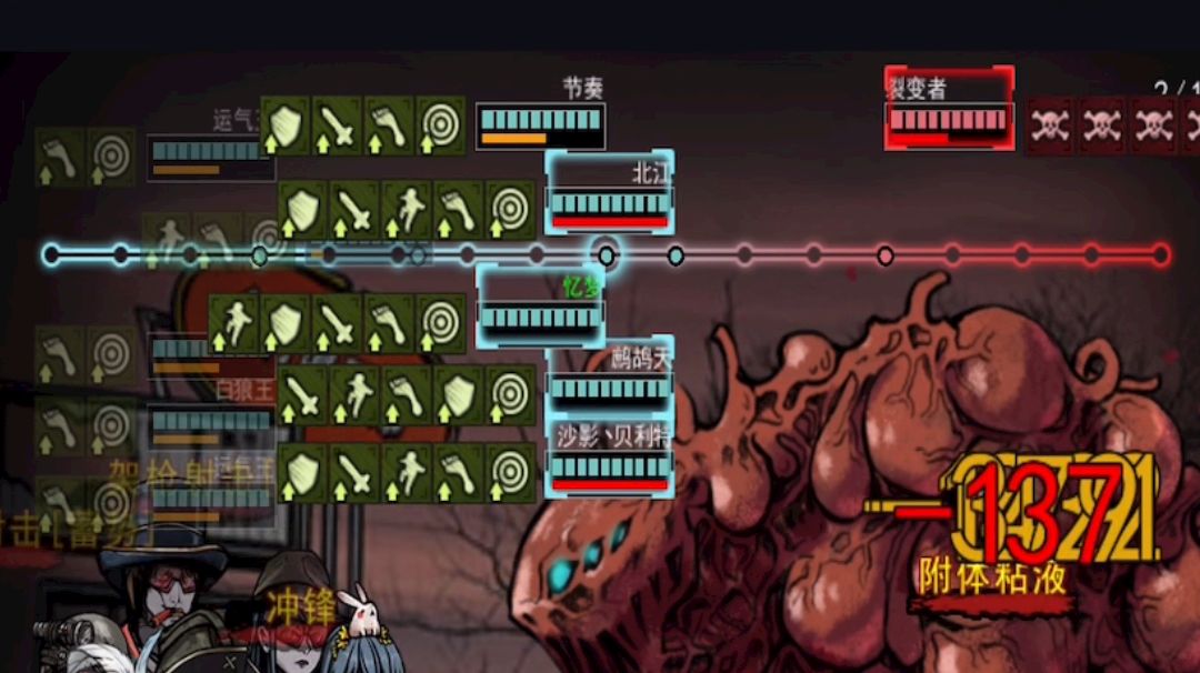 首先我们先了解boos技能与形态如图下: 裂变初始状态,我就叫本体。本体16万血量,一共有4个技能。 一技:附体粘液(群体伤害技能伤害相对低,第一次伤害200左右,然后造成3次250的流血,大概伤害不过千,但是裂变后其他形态也都带有此技能,稳定群伤) 二技:绽放(群体伤害相对较高,在两千多三千左右的伤害,裂变麻就是麻这个) 三技:收割(单体伤害相对较高,攻击最后队伍最后一个人,在两千多三千左右,这