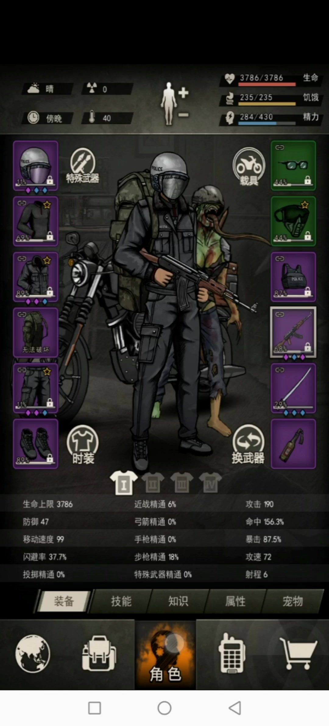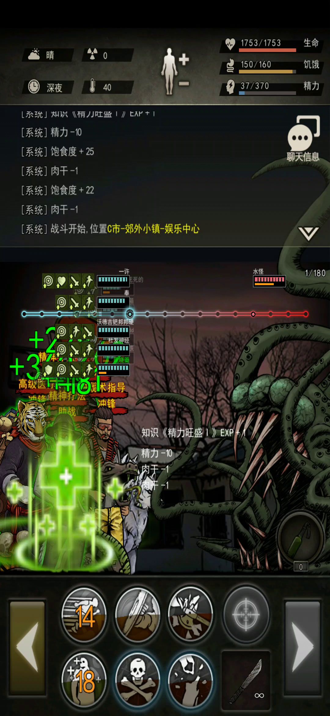 0:00-1:26变异尸潮45波(失败3次) 血3786-防47-攻190-爆87.5 技能:架枪(蓄势5)/鹰眼(破绽2)/快射(强力1)/闪(激素5)/精(回春3)/高9打法:硬刚+燃烧瓶 1:27-2:12双江码头-陌生人(失败8次) 阵容:警盾+2AK 血3819-防47-攻190-暴88.5 技能:同上 打法(步):开局架枪,注意力放在后排的枪手。 打完过剧情,解锁“中心医院”,在“中心