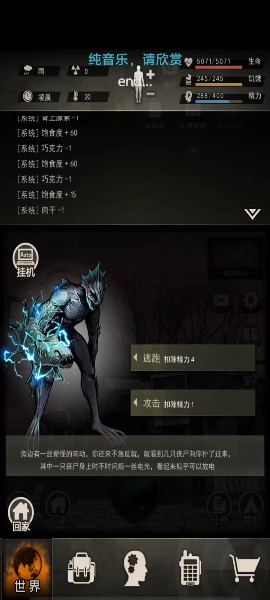 检查站特殊事件(带药草3个或者绷带1个): 搜索,提示有辆卡车开来,点等等→查看→打舔舔→胖子 →点了救治 药草-3 然后拿物资 (送肉罐头10个,华子2根 ,高级零件3) 仓库事件:(房间直接选择3) 搜索提示发现仓库一个门写着休息室,点查看然后没啥发生,离开。 继续搜索,提示发现一个员工通道的门,进去, 第一个房间无事发生, 第二个房间打装甲、胖子 然后点关门不然会一直打胖子, 第三个房间进去