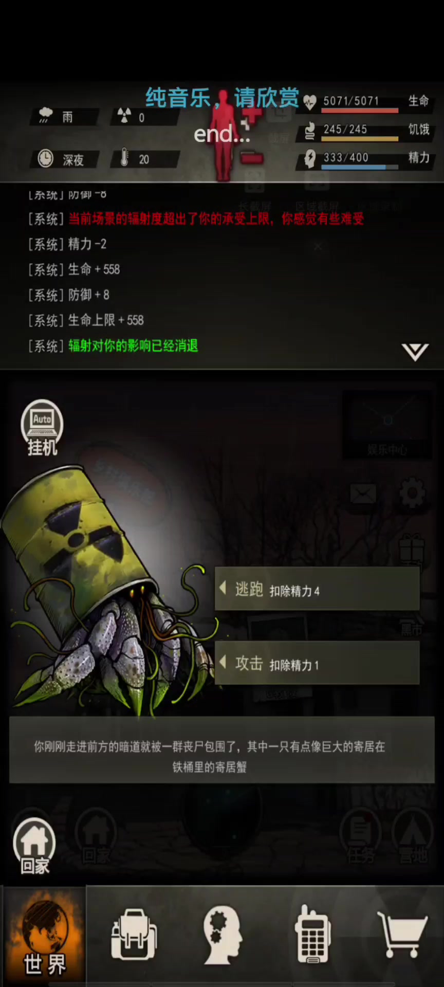 这个卡位的思路在于螃蟹喷毒的时候会僵直,距离有五格,也就是说离开他的三格攻击范围,他仍旧会在原地攻击,这个时候前后走位让水母往走一格就好。视频中,我为了保险用燃烧瓶开局骗出了辐射吸收,这样大概56秒左右,螃蟹就会喷一次毒+原地回血,大概能僵持好一会儿,足够卡水母了。虽然最后打不死,嘿嘿。因为我反应才9级,嘿嘿。全3配。 视频中,第一只拉到的水母我因为输出不足,所以后退了,不然吃毒刺会嘎,正常115