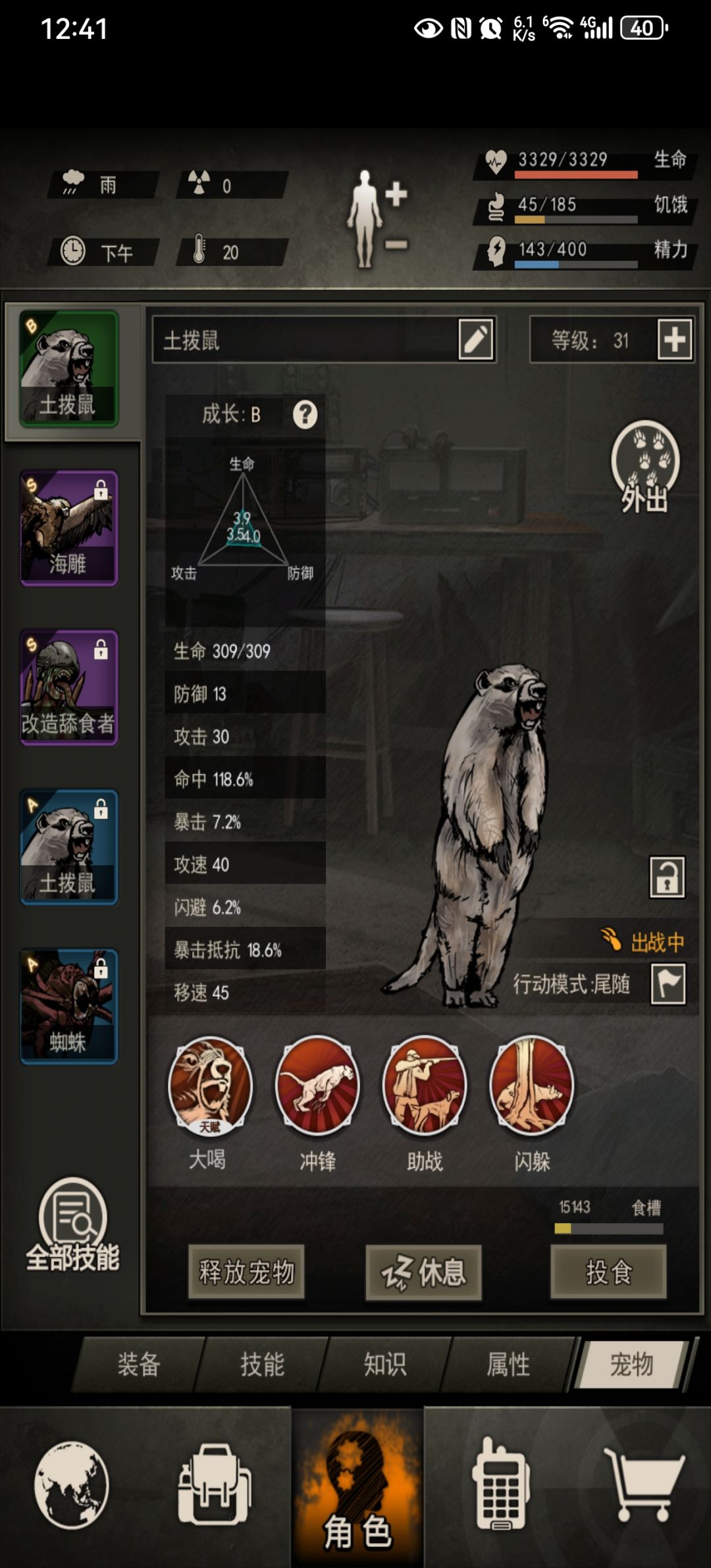药前属性:2486/115 药后属性:3130/140技能:3激素闪 3强力破甲 1强力重击 1级防护突 5高 1兴奋精 投掷物带毒矛 宠物带老鼠(矿洞抓)我的是30级老鼠,带助战(4级)协防(1级)献祭(4级) 在废墟搜索,然后拉回娱乐打前置(有龙虾和猎杀,这里不像开863医院那样翻了要重新打前置)开局看距离突上去,破甲重击(把闪留给2代蠕虫的连刺(6下),一代蠕虫连刺(3下)可以硬抗)然后就看