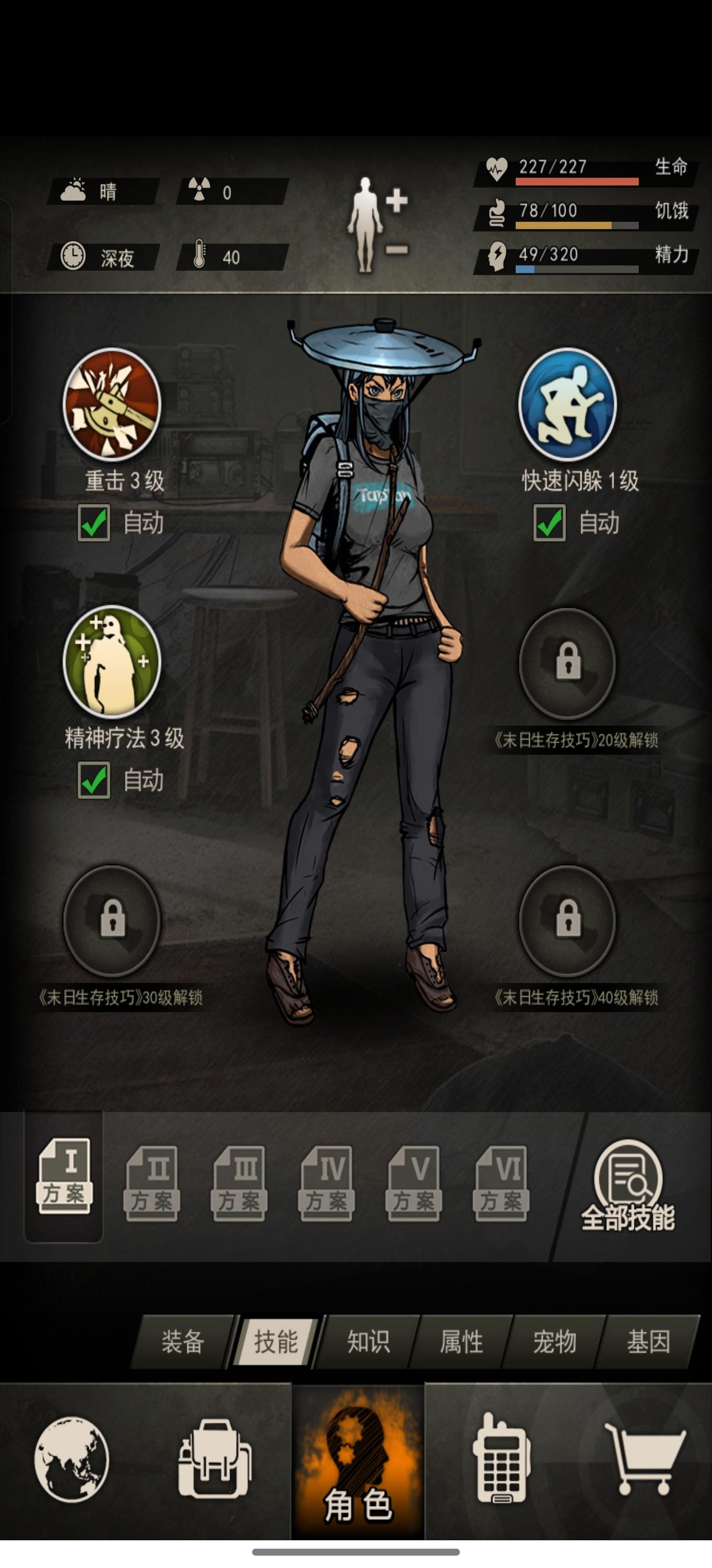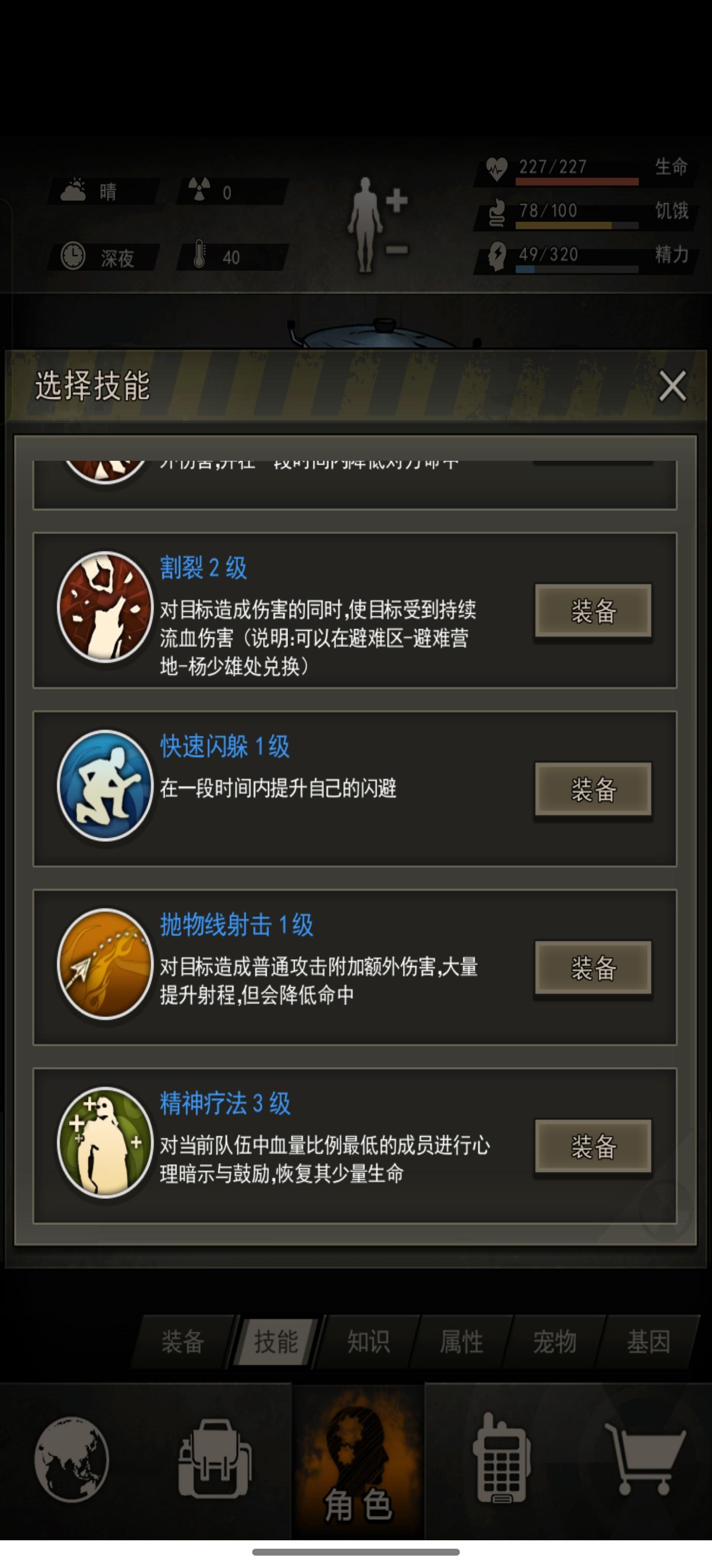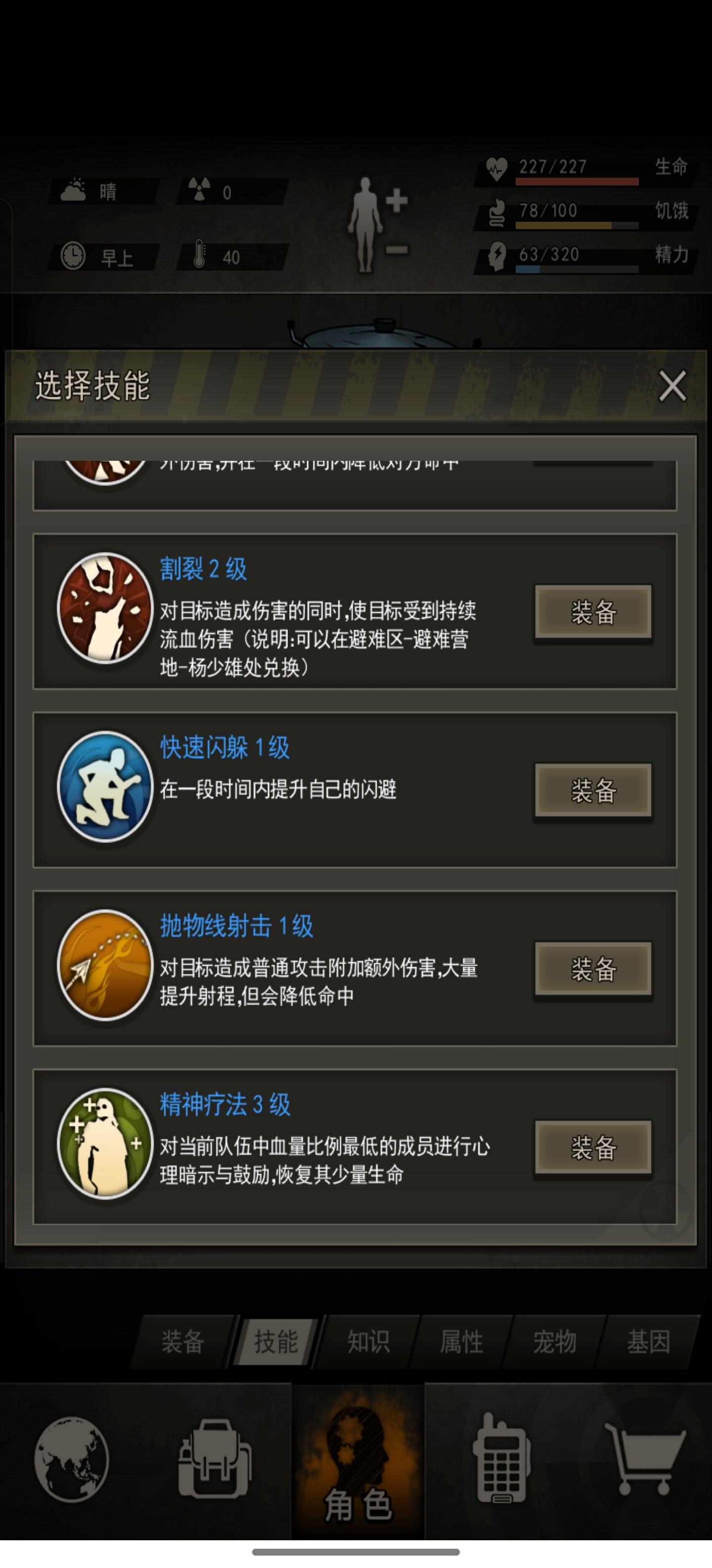 是在不懂这个精神疗法怎么用,打怪这个技能就是没亮过,还有就是为什么装上这个东西之后打怪攻击就-6的伤害啊,之前不是-11的嘛,有大佬可以推荐一下萌新搭配嘛,进官方群也不同意人进,实在不知道去哪里问啦#重建家园 以下是我的问题1.食物老是不足,去农场杀鹿或者找肉干是最优解吗(对于其他地图还没有解锁来说)2.支线主线卡进度条,实在打不过劫匪,该如何办?刷精力去找材料制造武器来提升攻击和防御吗3