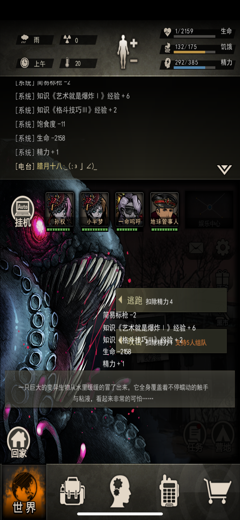 下午打蛇,统共280精打了13条蛇不是很满意,昨天330精20蛇搜索时,明显看出每个时间段怪物出现是固定的。但是,蛇的出现是有触发条件的假如一味的回家躲避会不断出现小怪。实在忍不住点击逃跑,偶尔会有蛇出来这种无谓的行为消耗很多精力我挺讨厌这点。我总想效率高一点。