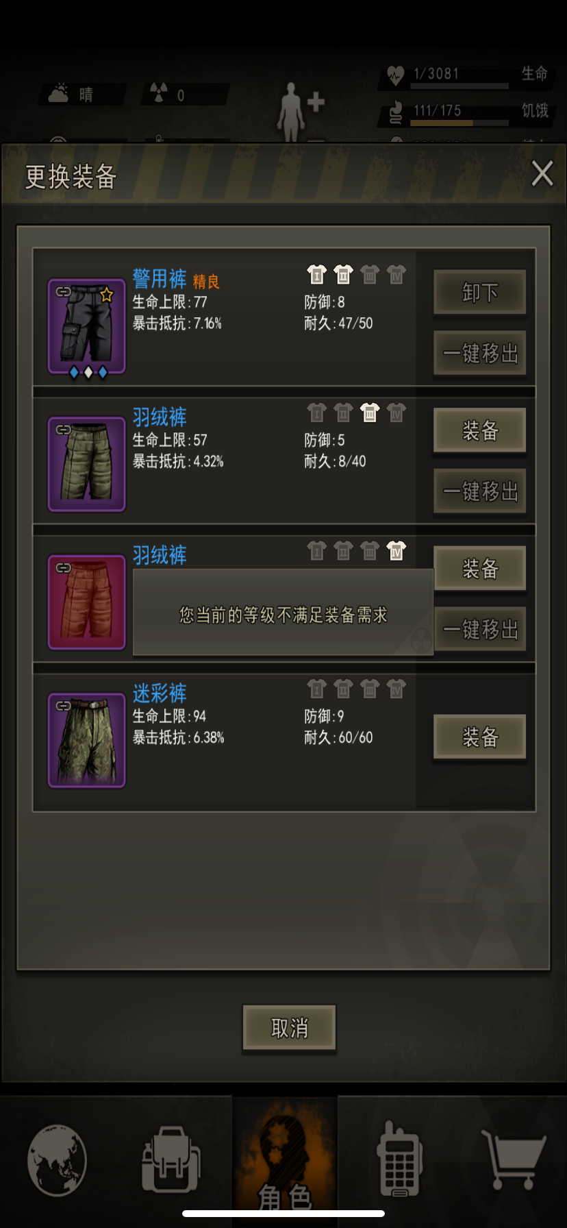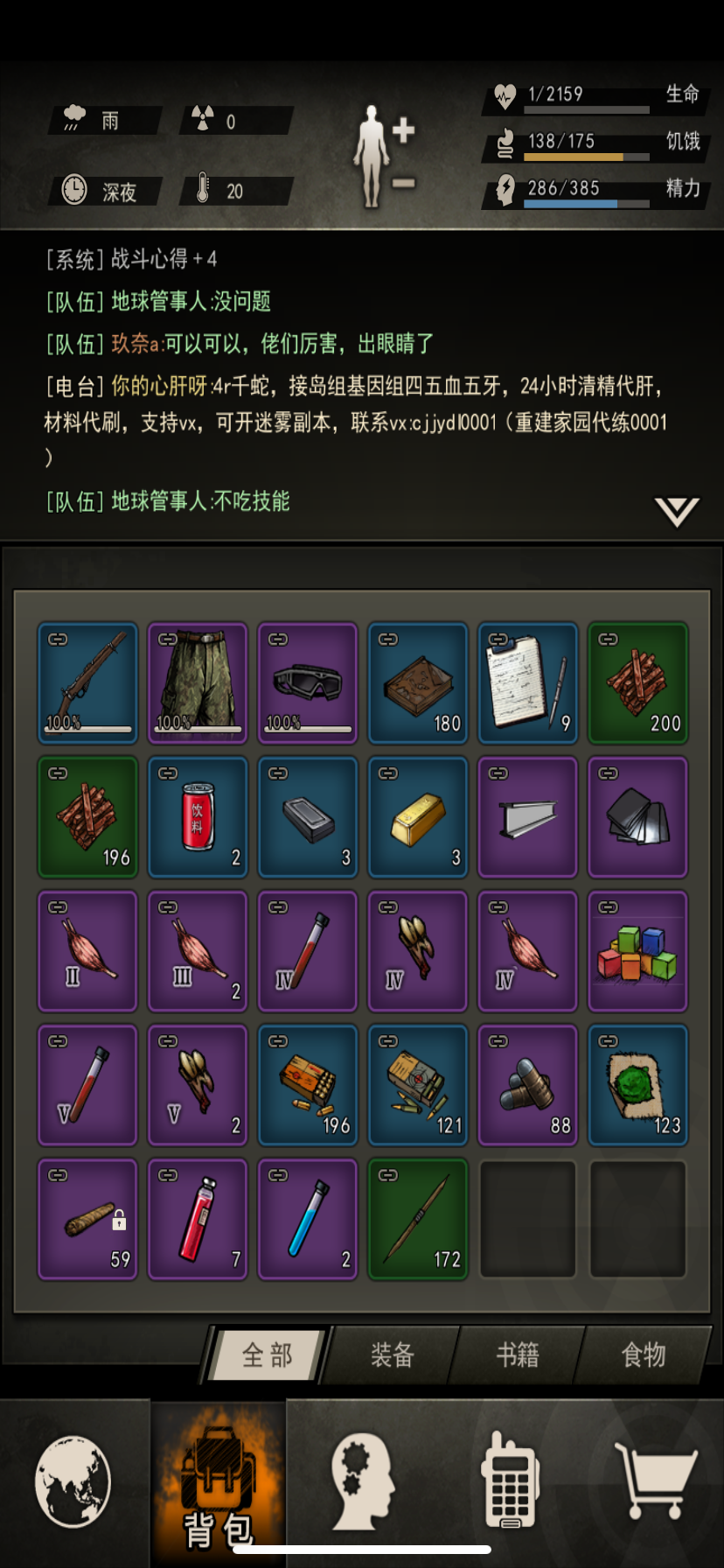 哑铃 !哑铃 ! 说起健身器材 你一定会考虑到你是玩刀的玩枪的 还是玩弓箭的 对于前期的萌新来说 刀肯定是主要的 因为手枪 弓箭 步枪 都是需要耗费大量弹药 很难玩的起来 但是刀不同 只需要修理 所以主武器一定是选择近战刀(可以用手枪弓箭等开图用) 所以必定是哑铃健身 提升力量 力量是很多地方的入门券 打蛇也是靠力量 当蛇童也是需要力量 背包里放足够的食物 最多可挂机健身24小时 健身分别是健身一