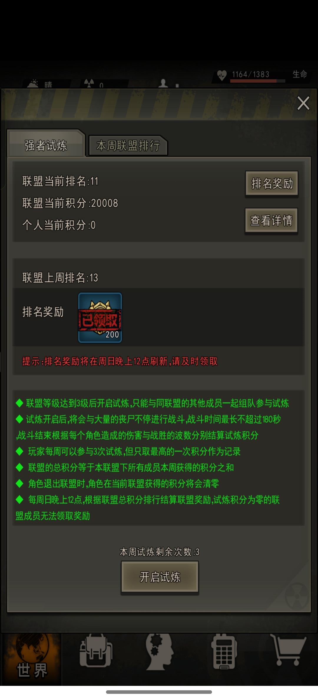 联盟试炼一周一次 (强者试炼) 可以兑换(s级宠物)改造舔食者 每周星期一,重新排名 按照联盟总积分 给联盟排名 参加试炼的门槛是你所在的联盟必须达到三级 (只要联盟达到三级就有保底200试炼币)(只要你参加就能拿到保底)(星期一去试炼哨所领取)(退出联盟就没了) 然后和盟友一起组队 只能和自己相同的联盟组队 参加强者试炼 “联盟积分” 是每一个人在里面打的伤害 达到的分数 整个联盟一起,就是“总
