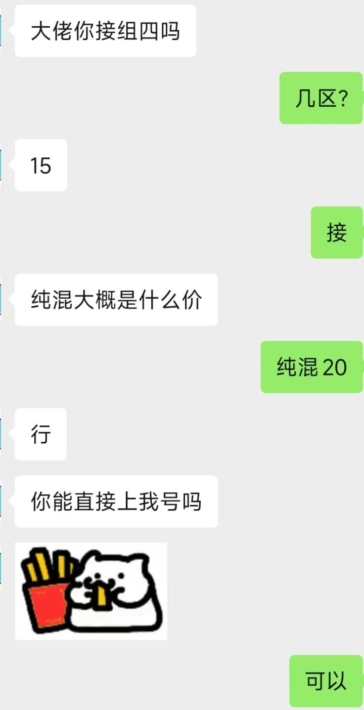 在周五那天晚上,一剑天来的会长李三连把我小号踢了理由:是我坑萌新,组织四收费太黑而我的收费标准是组织四那些都是公屏公开的这个萌新老板呢图六都没开,找我买的纯混,我也没忽悠他,直接就报价了,截图在上面。另外,我是帮老板代挂的,上号后发现老板图六都没开,就又问了老板一次,毕竟纯混岛组要便宜不少,然后老板说是买组织四,截图第二张。最后呢,觉得贵可以不买,如果你觉得纯混只值12r,你可以接,反正