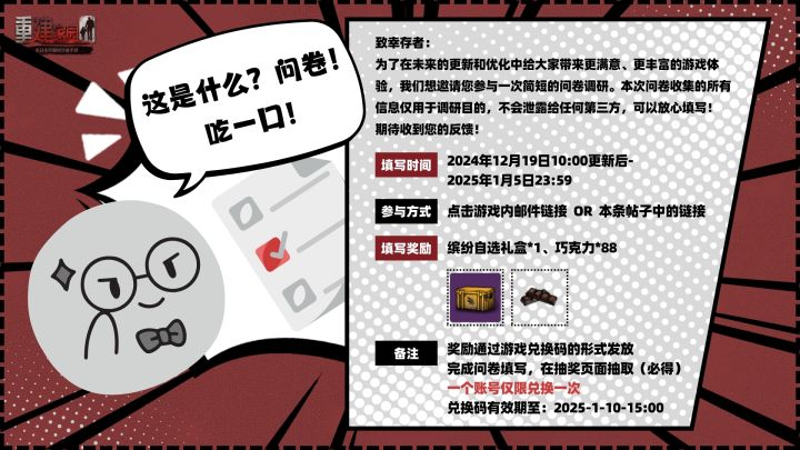 致幸存者:为了在未来的更新和优化中给大家带来更满意、更丰富的游戏体验,我们想邀请您参与一次简短的问卷调研。您所填写的内容,会作为我们后续更新的重要参考,我们会认真查阅每一份回收的问卷,期待收到您的反馈!🥰⏱填写时间:2024年12月19日10:00-2025年1月5日23:59📥参与方式:在游戏内推送的邮件中点击链接参与,或是直接点击此处🎁填写奖励:游戏兑换码*1(内含:缤纷自选礼盒*1、