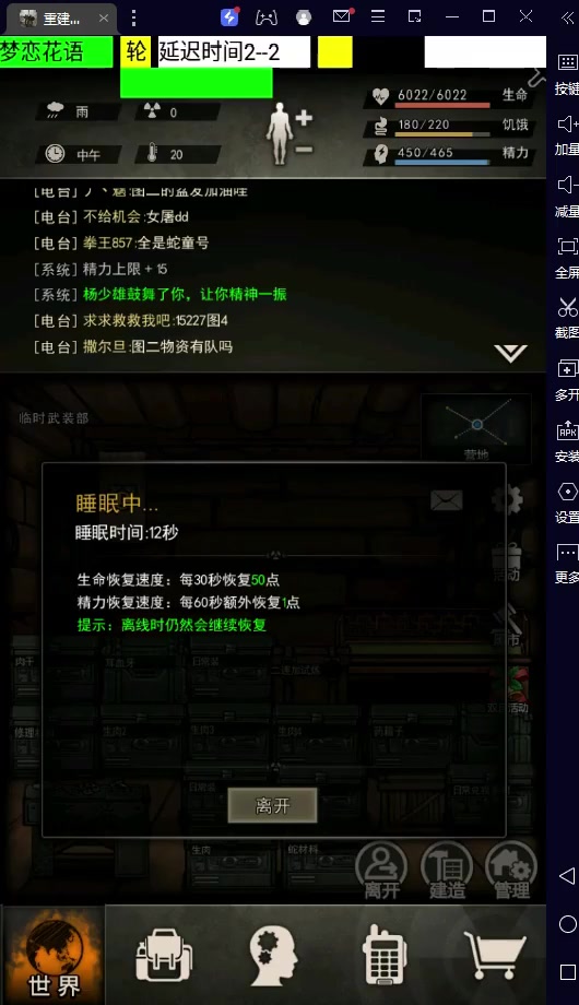 是在不懂这个精神疗法怎么用,打怪这个技能就是没亮过,还有就是为什么装上这个东西之后打怪攻击就-6的伤害啊,之前不是-11的嘛,有大佬可以推荐一下萌新搭配嘛,进官方群也不同意人进,实在不知道去哪里问啦#重建家园 以下是我的问题1.食物老是不足,去农场杀鹿或者找肉干是最优解吗(对于其他地图还没有解锁来说)2.支线主线卡进度条,实在打不过劫匪,该如何办?刷精力去找材料制造武器来提升攻击和防御吗3