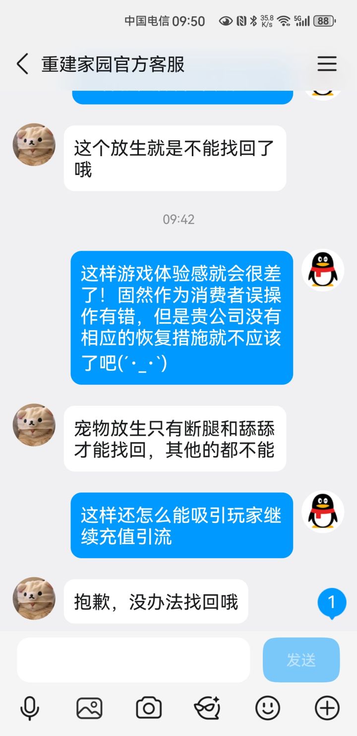 家人们,谁懂啊!昨晚经历二百多抽。才抽到一个满攻白狼王。因为一个误操作放生,多方询问客服都无法恢复。一个花费大量时间、金钱和运气投入的游戏,却没有对贵重物品的保障机制,这是磨灭玩家热情和信心,也是失去玩家信任的行径!希望官方能重视起来,不要让仍热爱这款游戏的玩家寒心和失望!