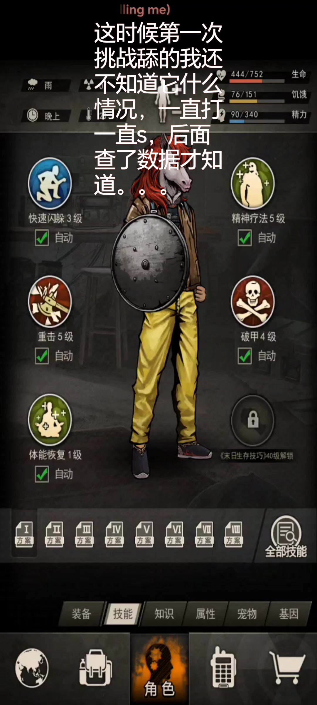 如图,感觉进度一下慢下来了,好多探索方向,也不知道干啥。①现在打算在做一个蓝色斧头,木工还和刀具生产还差一点。②力量是吃了烤肉+2,健身1满了,下一步打算练瑜伽,可以吗大佬们。③有去做蛇童,有点社恐加上不熟练,老是被打死😭,打算练一下卡位再去,食物不缺了有很多肉干。④我种了很多土豆,我之前老是吃烤土豆,但没柴了,拿土豆没办法。现在是每天去图二森林捡柴,但是消耗很快。⑤最后一张图是屯的东西