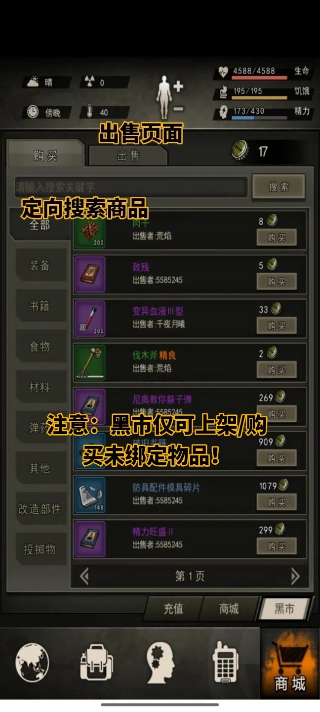 讲师:一区,逐梦一一山羊点开头像观看更多奇怪的游戏知识~如果攻略帮到你了还请点个赞让更多人看见!要过气了_(:з」∠)_本期内容:1,黑市的重要性2,黑市商品及相对应原始价格3,了解物品价格的浮动因素4,黑市交易税率以及如何卡税黑市的作用: 对于0氪而言,主动参与尸潮物资获得非绑定物资,将物资挂在黑市上等待氪佬用充值货币(盖子,简称g)购买是0氪唯一获取g的方法 对于氪金玩家