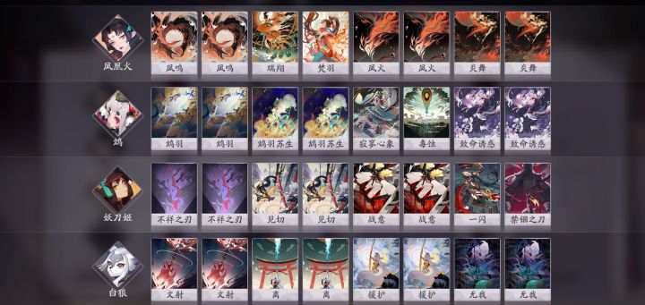 茨木童子、酒吞童子、青行灯、跳跳弟弟、书翁、觉、判官、以津真天、青坊主、青蛙瓷器、座敷童子、大天狗、妖刀姬、一目连、雪童子、兵俑、雪女、妖琴师、山兔、山童、鸩、清姬、犬神、桃花妖、萤草、姑获鸟、海坊主、凤凰火、白狼(以全平台上线实装为准)