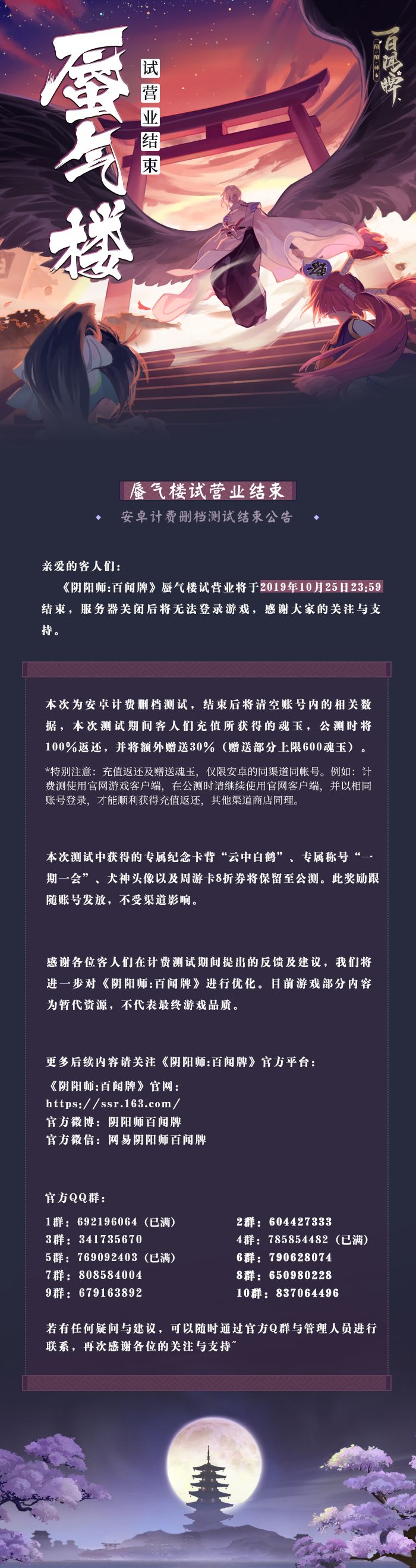 《阴阳师:百闻牌》安卓删档计费测试将于10月25日23:59正式结束,巡游船即将返航~在蜃气楼试营业的日子里,可爱的客人们就像玄关的温泉水一样暖呀!