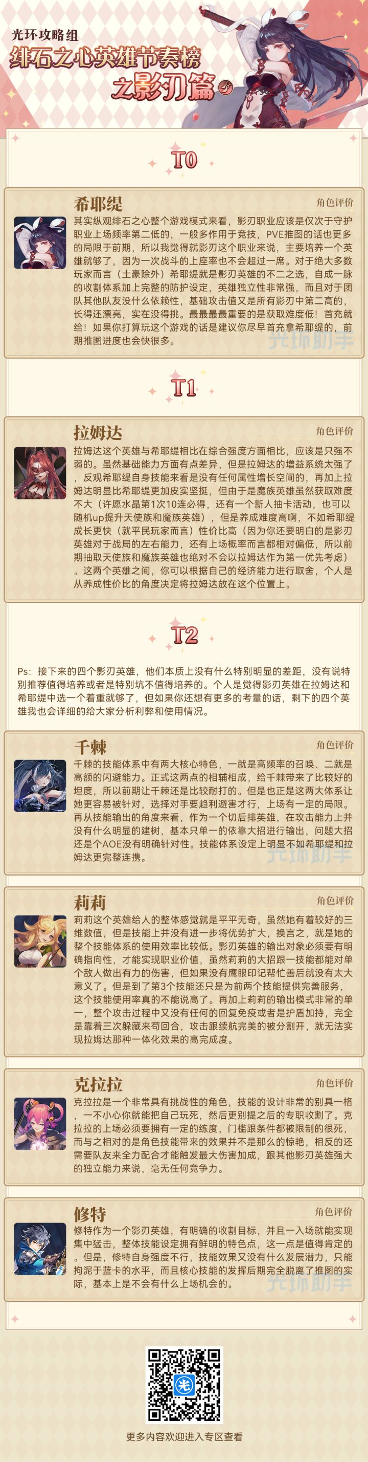 医师大人好呀,今天玲带来了新的游戏情报哦~这次要说的是绯石之心的六大职业。所有英雄都有着自己的职业,职业之间还存在着克制的关系,如果能搞清楚每个职业的特点,将会使医师大人变的更强哦~那么下面请看:1. 勇者近战 高防 输出兼顾输出和防守的强力战士,防御很高,拥有持续输出能力,总是冲在战场的最前线,如果队伍输出不够,可以考虑将守护换成勇者弥补输出。顺便一提莱雅姐姐的职业就是勇者哦。是不是