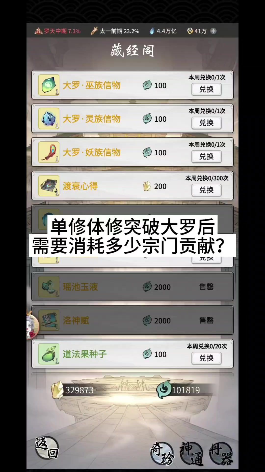 谨记飞升前要把铸器值花光 1.飞升当日每日任务以及每周任务的奖励不要领取 以及每日储物袋(都是等飞升突破后再领取) 2.坊市自动刷新买完所需,手动刷新待飞升突破后购买 3.飞升突破前丹药次数吃完(大境界突破刷新次数) 4.飞升突破后优先开地图,开到最高再开宝藏阁存货 5.宗门藏宝阁优先兑换武器衣服、饰品、法宝以及上品星尘、道法果,其次尽量当周兑换完洛神赋、瑶池玉液 6.药田全部改种道法果,每日浇灌