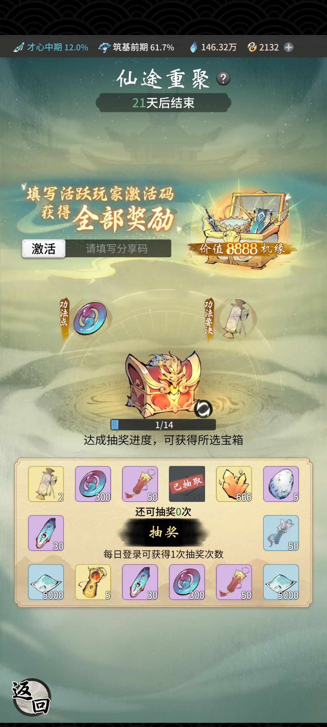 游戏讲介:选区(优先进最高最新服)→创人物时傍边有个接引令输入N8K2GS0领取稀有大礼包,法修体修各有优势,看个人喜好 人物篇: 成就:必领。 功法:每天必买一次,优先领悟加洞府灵气的功法,修为丹药,其次秘境灵石加成。功法修到圆满只是功法里面的属性+100%,而不是功法效果也加百分百。 看你需求,追求战力就升满功法,功法点很缺。 古宝篇:古宝优先注灵与升级加洞府灵气古宝,其次修为丹药古宝,其次秘