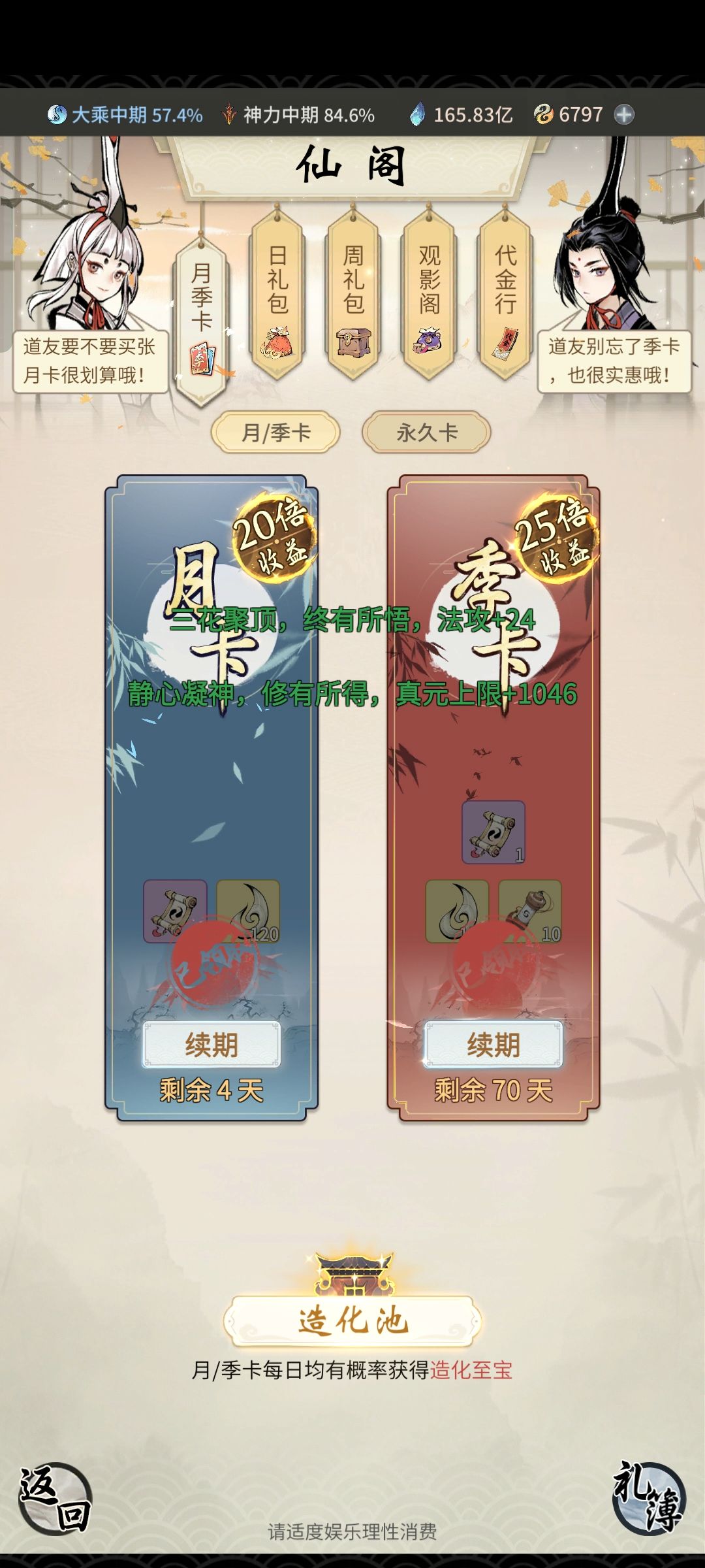 新人小伙伴一定要记住,一念逍遥的礼包越贵,性价比越高,举个例子宁可买10个648礼包,也不要买20个328礼包。以此类推6元礼包和30元礼包性价比最低,不建议购买!月卡季卡永久卡性价比非常高,建议购买![表情_斜眼笑][表情_狗头] 一念逍遥最强攻略: 1。礼包买什么:必氪每日68道缘玉,拉好友好感度能提供很多资源,所以一定要拉满道缘。每周198跃迁令。天命无上限,多买648即可。拉满天命拿衣服,