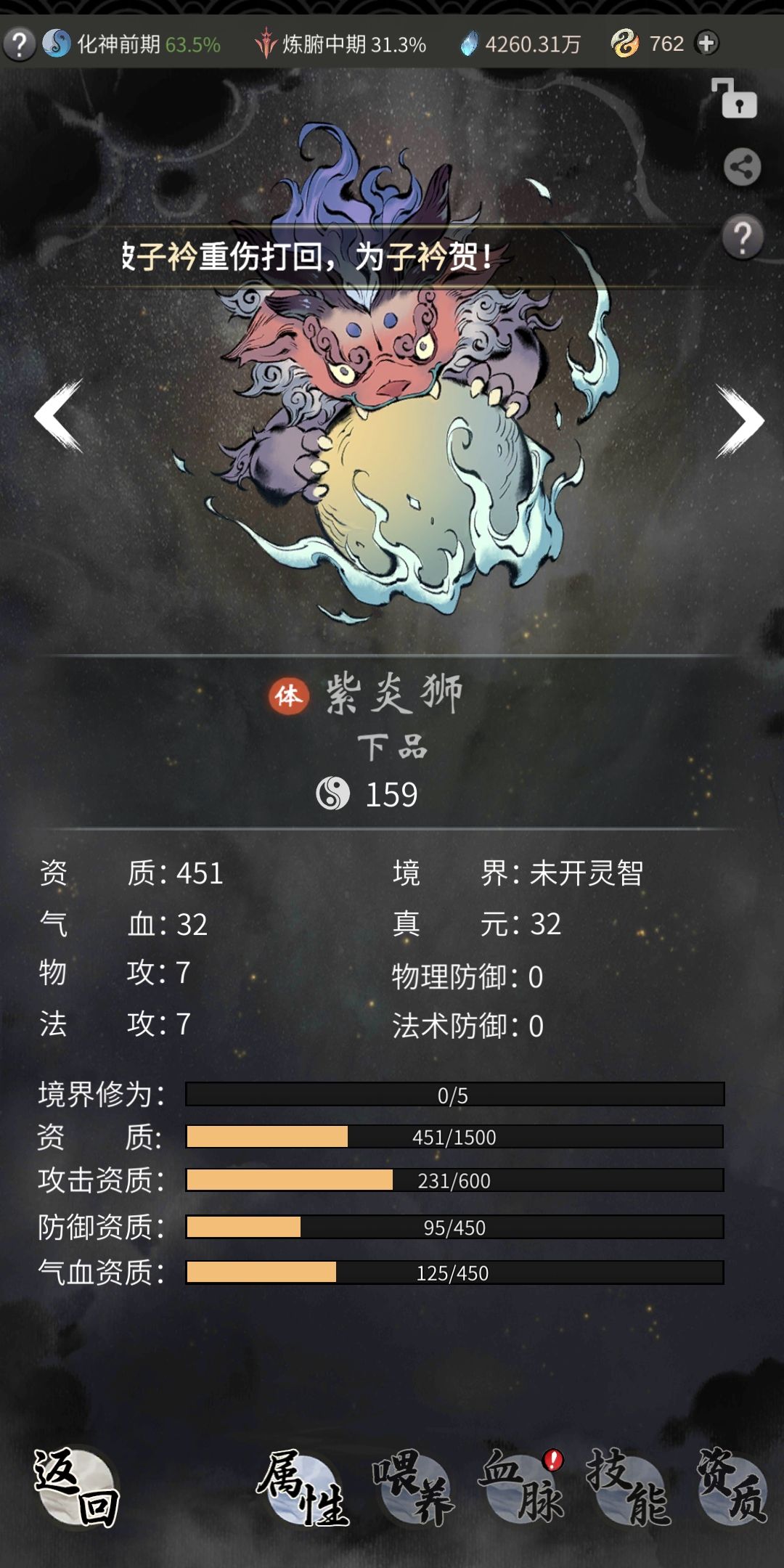 本人第一次发攻略,有啥错误欢迎指正 首先,每只灵兽兑换出来,都有一个资质 资质=攻击资质+防御资质+气血资质 这个资质是可以刷的,首先随便提升一下血脉或者等级,然后去还原,就能得到数值完全不同的一只灵兽 初始我们就只看总资质就行了,因为接下来吃资质丹,加的是哪一项是随机的,总资质的高低决定了你能省几个资质丹。同一只灵兽,每次还原总资质都会改变,一般刷到700以上就很不错(对平民而言,大佬请随意) 灵