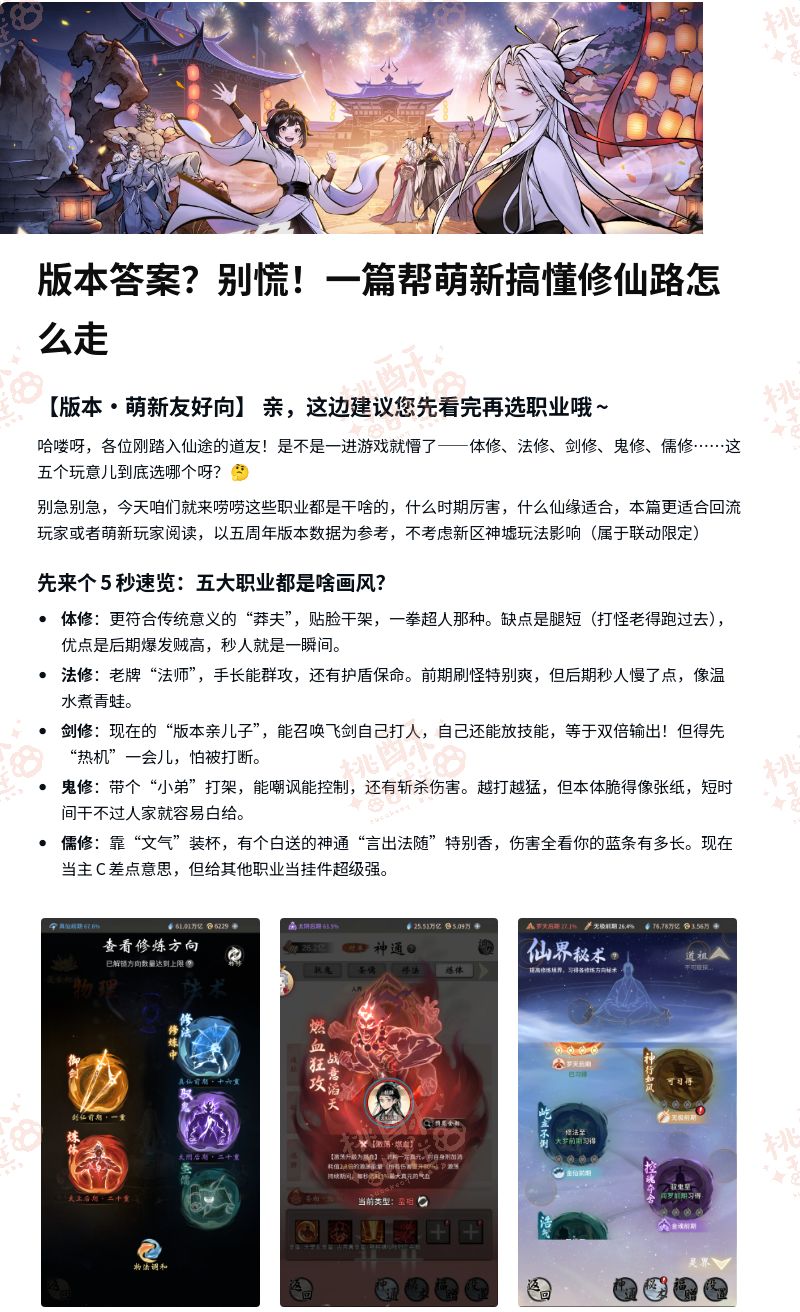 一念逍遥快四周年了,给这段时间入坑的萌新一些建议[表情_开心] 一念逍遥修炼有五种方式:体修、修法、剑修,鬼修,儒修;新手玩家可以根据自己的情况和喜好选择;前期不建议多修,会耗费大量材料及资源,从而跟其他玩家差距越拉越大。如果想快速成型,建议选择体修和剑修,又帅又能打,且成型巨快,适合想要快速入坑有体验感的萌新,如果非要炼法,那我建议堆血量,也就是法修加坦克方向,强度很高。 忠告,开药田很废机缘,