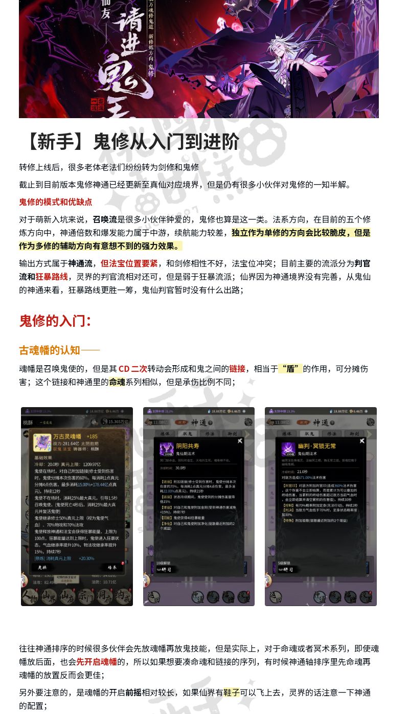 敲重点!鬼修和新大区7月5日上线!不少仙友也是趁此机会入坑和回坑,想尝试一把驭鬼之道,但鬼修到底要怎么玩?小师妹搜刮了一批法宝神通搭配攻略,希望能助大家成就“鬼王”,快来一起看看吧~ 作者:桃酥甜糕 桃酥认为鬼修有两种流派玩法,一种是积蓄能量,进入狂暴攻势,适合喜欢快节奏的仙友;一种是以守待攻,以控术应对敌方,灵活闪避,恰当时候蓄势一击。 她也分享了一组神通搭配,离魂钉先行争取输出节奏,古面嘲讽,