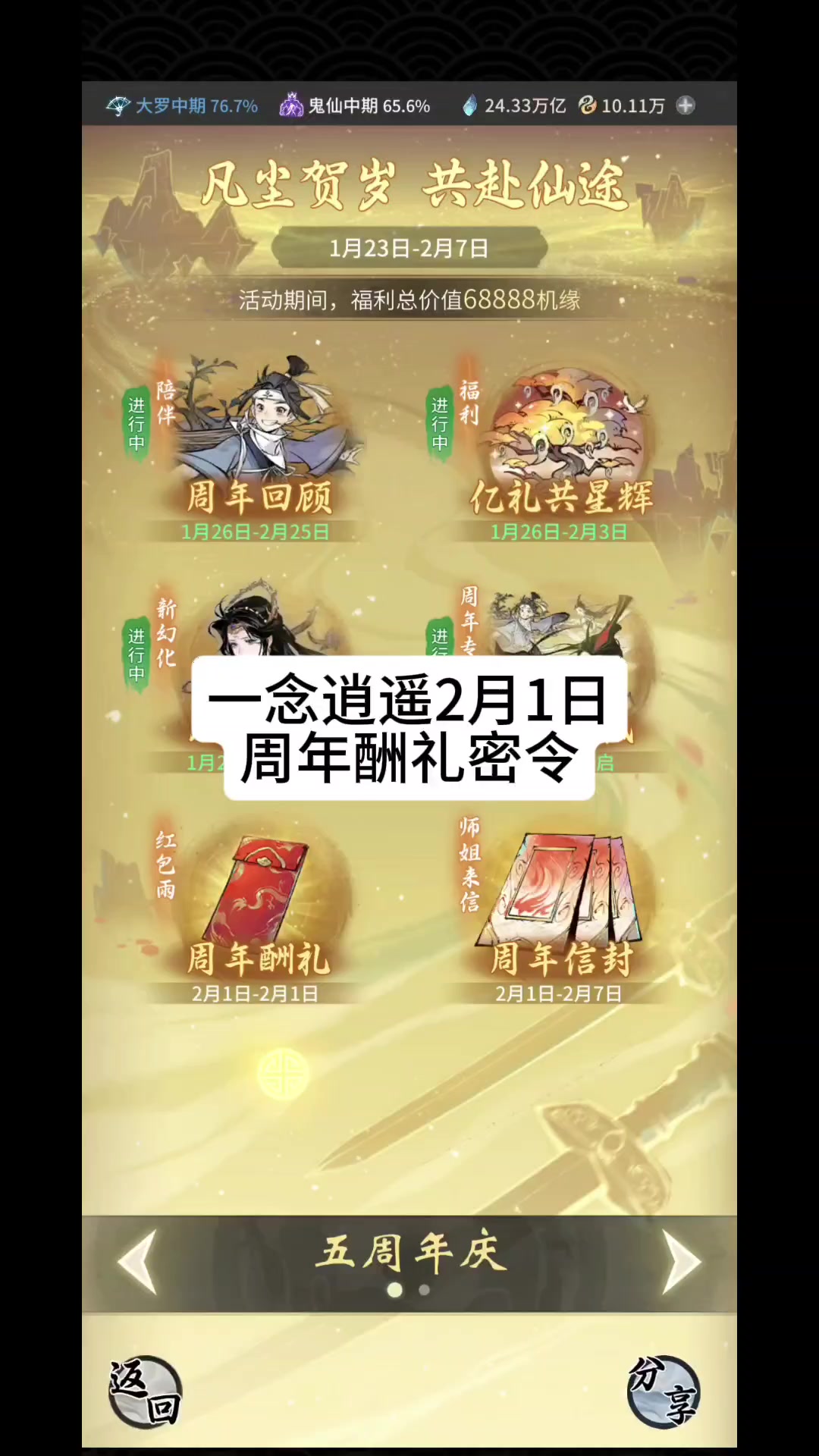 五周年庆典今日正式开启!!!进入游戏,在周年活动踏星途跟联动角色林七夜切磋过招再与新仙灵年结识这个周年庆,福利多又热闹可以免费拿月卡、秘境刷至宝还有免费代金券、时装可领取!今日一念斩神新大区开放,盛况更是非凡仙友云集,诸神隐域,组队斩神也还在等你参与!今天还有两个小更新,欢迎大家查看互动溯梦仙途活动介绍五载仙途,回首依旧温暖如初“溯梦仙途”活动今日上线仙友可在游戏内-活