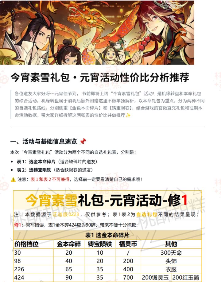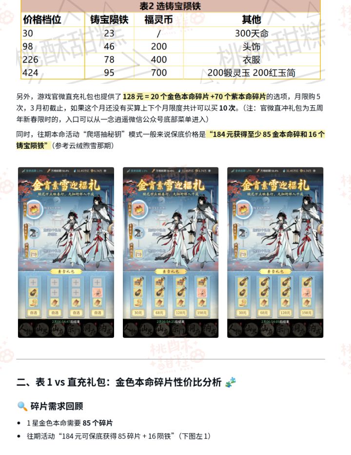 各位道友大家好呀~元宵佳节到, 节前即将上线“今宵素雪礼包”活动!是机缘转盘和本命礼包的综合活动,机缘转盘属于消耗后额外附赠这里不做单独解析,以本命礼包为重点,分为两种不同的自选礼包路线,分别侧重【金色本命碎片】和【铸宝陨铁】,结合游戏的官微直充礼包和往期本命活动数据,带大家详细拆解这两张表的性价比并做推荐✨#一念逍遥 #一念逍遥五周年 #一念逍遥攻略 #游戏日常