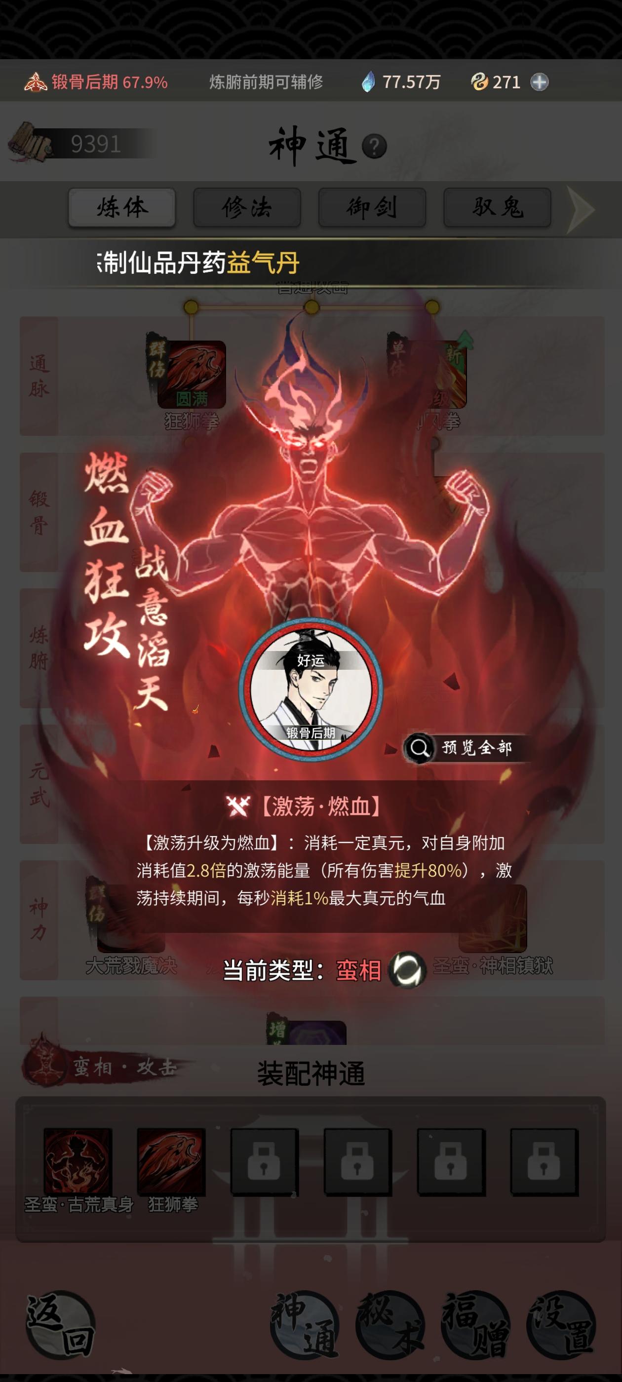 圣体】每次触发圣相时回复一定比例气血【蛮体】附加时若气血低于特定比例,则获得一定比例伤害减免