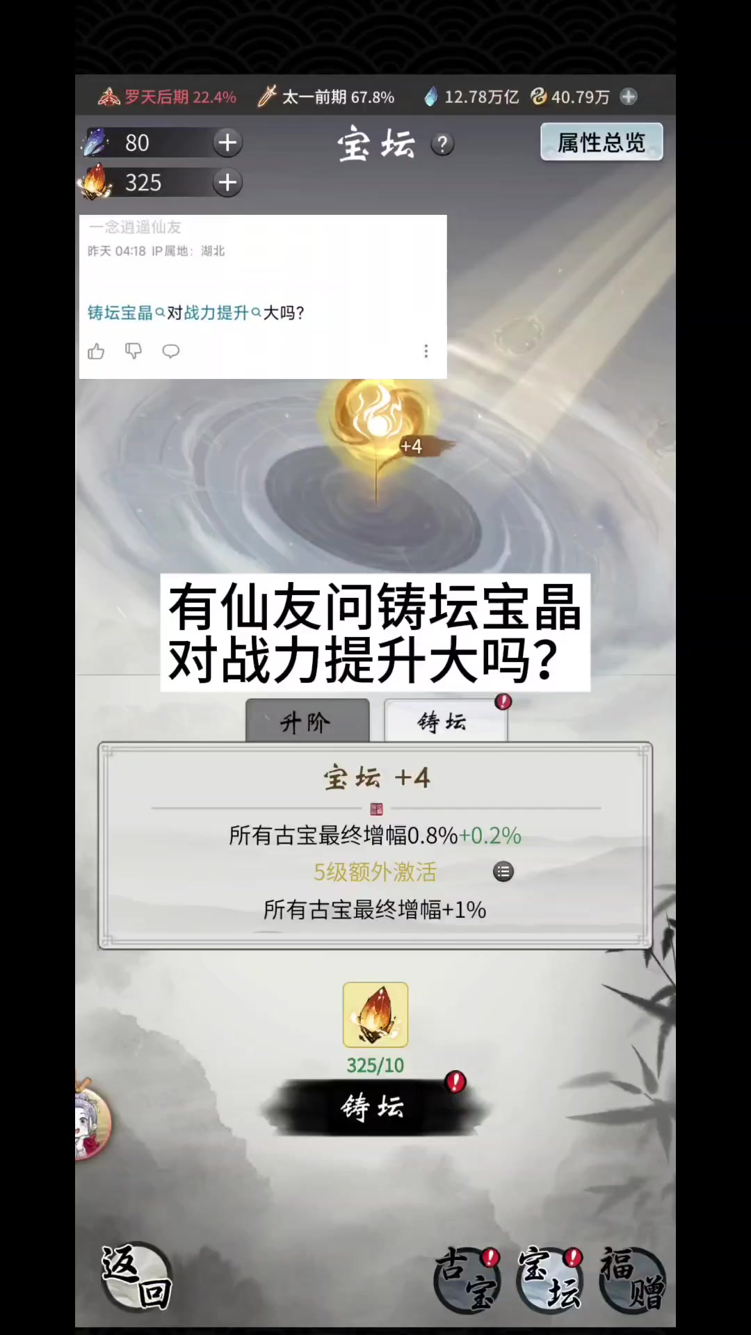 根据宗主提供的方案,将所有面具缓存锁和臂(只有臂出了紫没办法),然后将换下来的面具全部还原,把加攻击的扇子和首饰都拉到+90,还把这两个装备加法攻属性的淬灵拉到蓝色。结果在倒数结束时boss还有25%左右血,只能放弃。半夜睡不着随便上号看看,发现广寒宫结算拿了箱子,用箱子开了个“宗门战击杀小怪+法攻”的古宝,把那个古宝升到了2星还注灵两次,想着说不定现在法攻就到了,继续尝试。这一次我顿悟出了