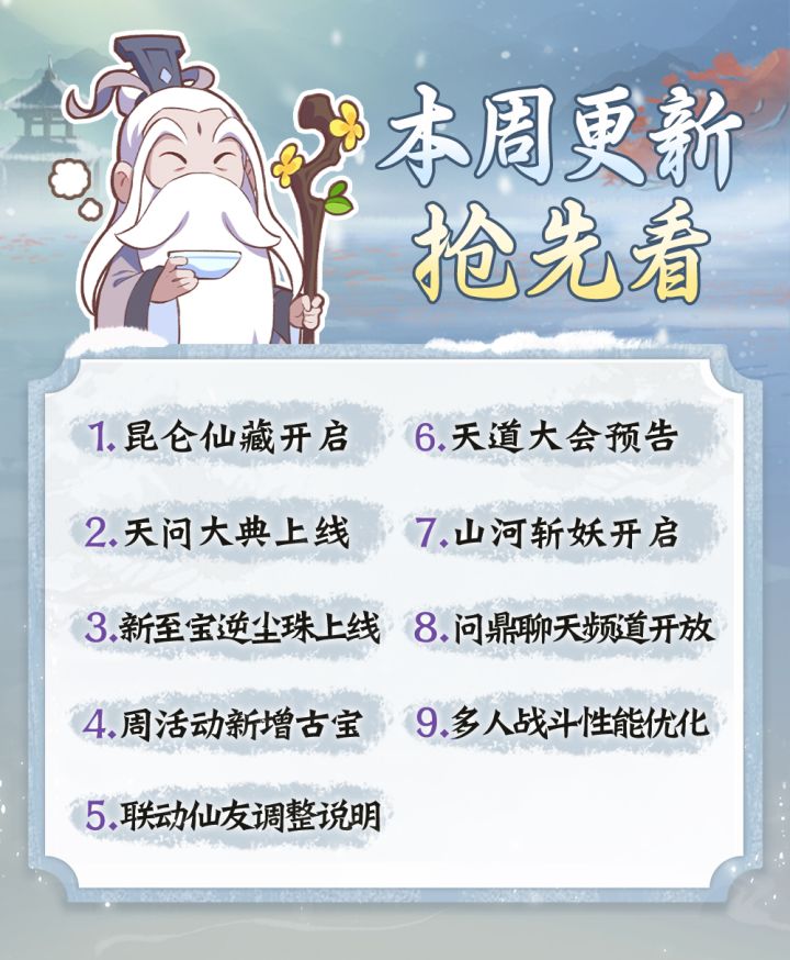 01 昆仑仙藏开启11月22日~26日在已飞升灵界位面开启结丹对应境界及以上仙友可参与完成历练,开启仙藏,积攒仙珠可获取红品古宝碎片、锻灵神玉等奖励在开启仙藏活动≥4次的位面主题古宝将替换为“天机化身盘”宝库将上架一定数量的紫阙仙藏自选箱可从中获取过往红品古宝碎片02 天问大典开放全新题目问答活动11月23日开启返虚对应境界及以上仙友可参与活动分为初试、复试、终试等多个阶段