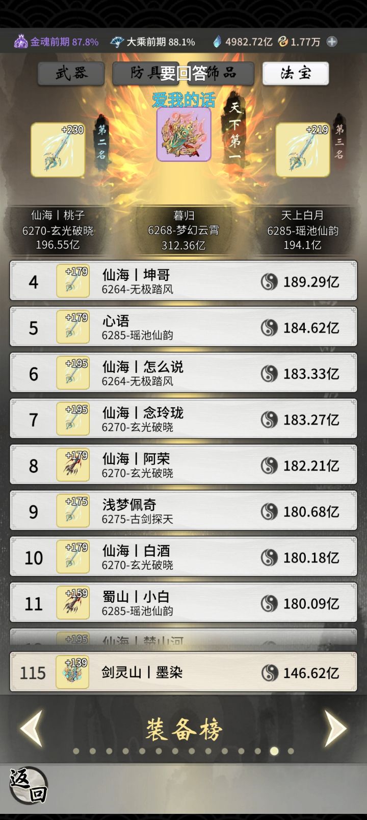 总共一年四个月零二十天,前年11月1日开始玩的,中间也退游过几回,总共充了3次月卡,应该有两次免费的月卡,所以总共有过5个月卡,有三个至宝,算是零氪党,本来是能追上大部队的,但是因为中间退游过,所以现在开始当道年玩了,我之前开过两次新区,斩神大区的一区也开过一次,当时氪了八百多块,但都打水漂了我的目标一直是最高境界,所以并没有一直当道年的想法,我以前的名字叫“目标太乙仙”,后来大罗出了之后就叫“