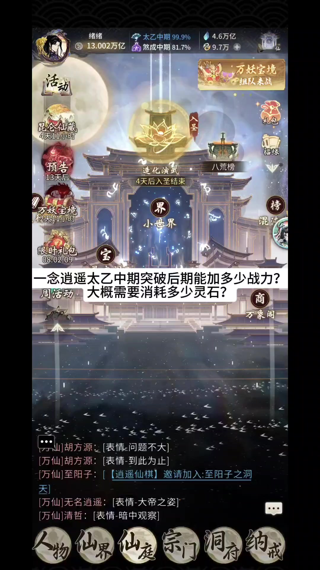 一念逍遥太乙中期突破后期能加多少战力?大概需要消耗多少灵石?