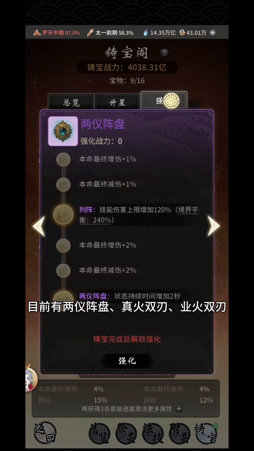 01、装备、法宝属性修正近期收到反馈,装备所得的会心倍率属性值与最终计算结果无法对上因此我们做出以下的调整~修正装备、法宝的会心倍率属性计算公式修正后会心倍率最终值会有所下降但修士的战力几乎不会有波动调整祭炼额外激活效果里的会心倍率每10级所解锁的会心倍率从4%调整到6%该部分属性调整后实际收益与调整前一致02、修炼方向强度平衡调整各修炼方向强度平衡有所调整其中法修神通调整