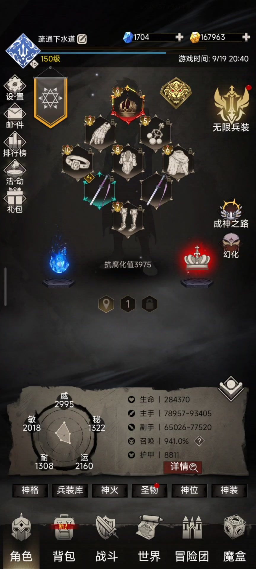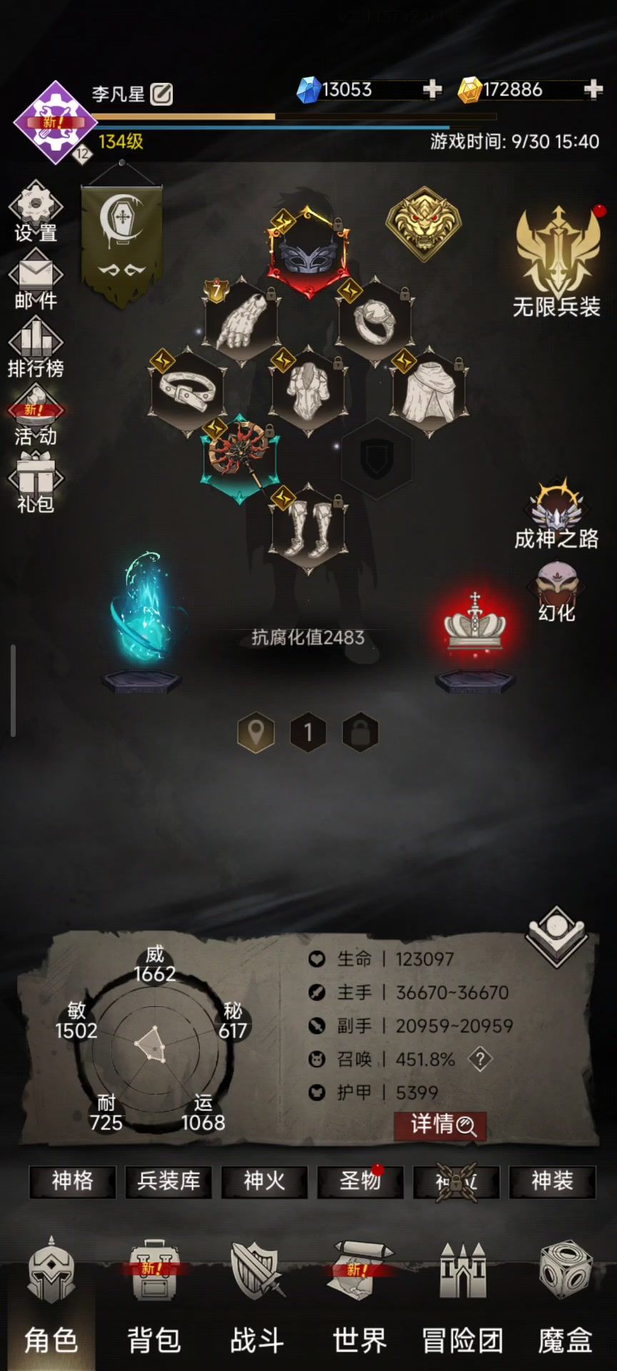 一直没有出泰坦的详细攻略,也是因为我自己也是一直在摸索中。以前也发过几个关于泰坦的帖子,看到大家讨论的那么热烈,我觉得也应该详细的发一个关于泰坦的攻略贴了。 本人四区泰坦,ID甜笑着。 首先看一下,万神T70,塔149,全身16,只有一个帽子17(下面会详细说),不算大氪,大家少充一点或者慢慢玩也能达到。 再看面板,关于这些属性后面会详细说。 首先关于兵装,相信从开服到现在,不管是豹子头还是氪金